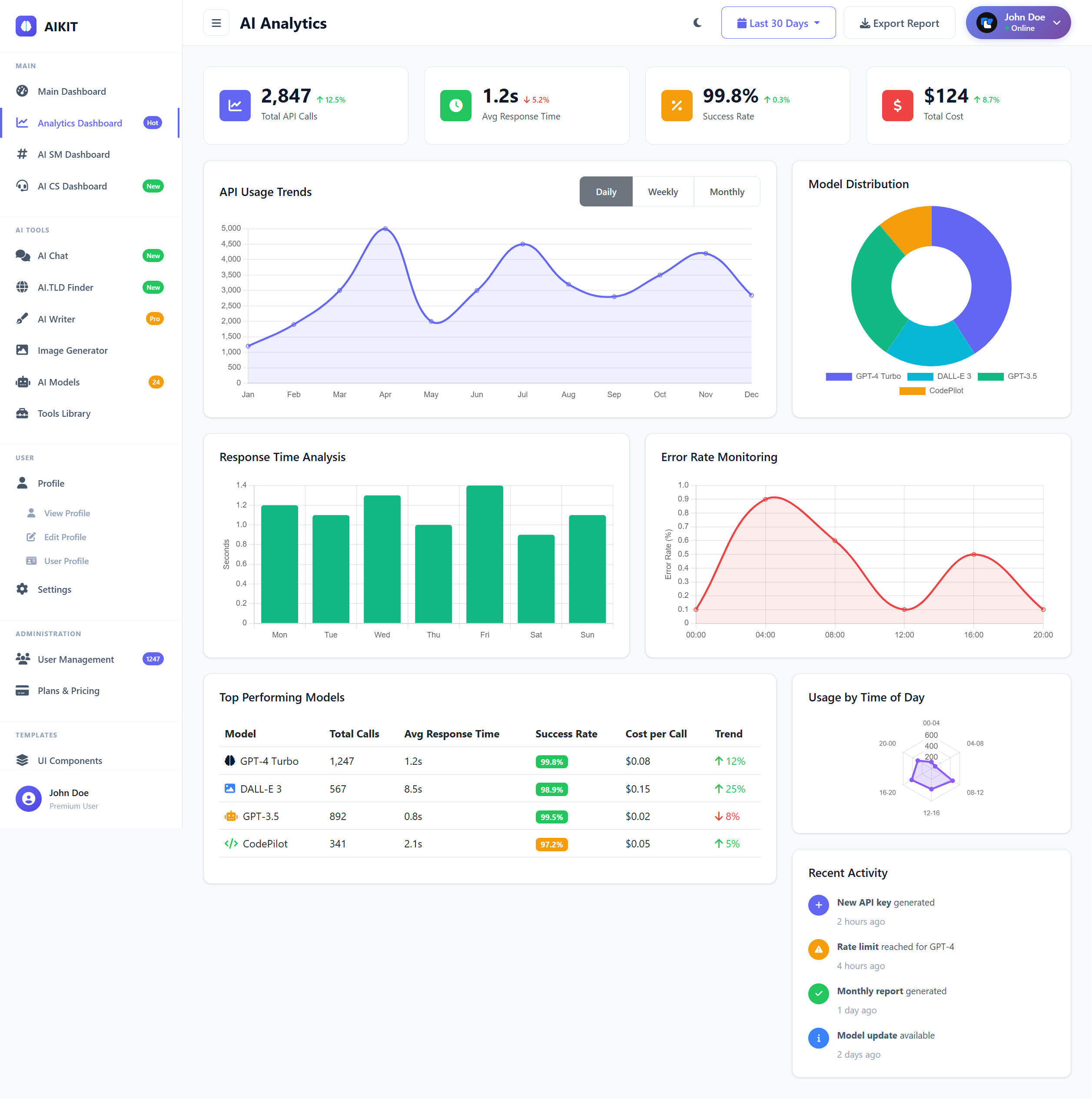 AIKIT PRO Dashboard is a cutting-edge, feature-rich admin dashboard template specifically designed for AI and machine learning applications. Built with Bootstrap 5.3.2, this comprehensive solution provides everything you need to create powerful AI-driven web applications with professional-grade user interfaces and advanced analytics capabilities.