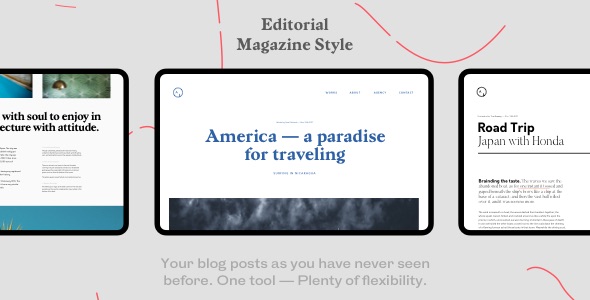 - Two different blog styles – ‘Minimal’ & ‘Magazine’ (notice that only one style is possible, we tweak the demo to show you both)