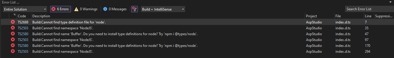 Severity Code Description Project File Line Suppression State Error TS2503 Build:Cannot find namespace ‘NodeJS’. AspStudio Source\Repos\PSS-SCO-V2\AspStudio\wwwroot\lib\jszip\index.d.ts 294 Error TS2688 Build:Cannot find type definition file for ‘node’. AspStudio Source\Repos\PSS-SCO-V2\AspStudio\wwwroot\lib\jszip\index.d.ts 7 Error TS2503 Build:Cannot find namespace ‘NodeJS’. AspStudio Source\Repos\PSS-SCO-V2\AspStudio\wwwroot\lib\jszip\index.d.ts 35 Error TS2580 Build:Cannot find name ‘Buffer’. Do you need to install type definitions for node? Try `npm i @types/node`. AspStudio Source\Repos\PSS-SCO-V2\AspStudio\wwwroot\lib\jszip\index.d.ts 47 Error TS2503 Build:Cannot find namespace ‘NodeJS’. AspStudio Source\Repos\PSS-SCO-V2\AspStudio\wwwroot\lib\jszip\index.d.ts 97 Error TS2580 Build:Cannot find name ‘Buffer’. Do you need to install type definitions for node? Try `npm i @types/node`. AspStudio Source\Repos\PSS-SCO-V2\AspStudio\wwwroot\lib\jszip\index.d.ts 170