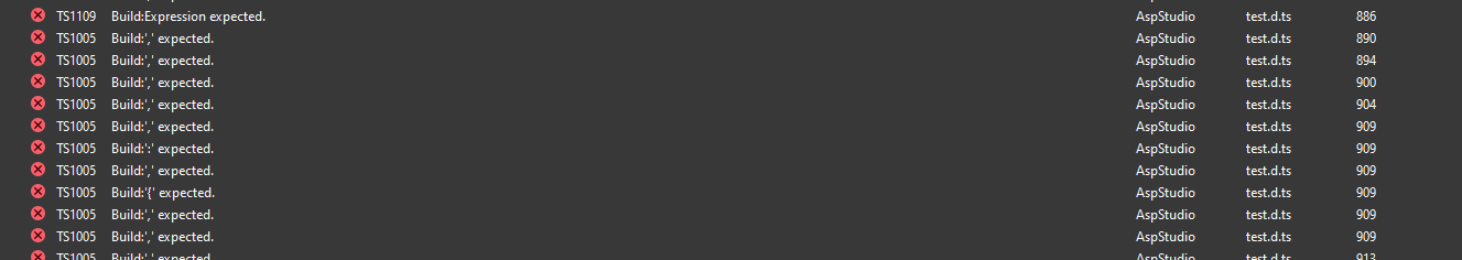 Severity Code Description Project File Line Suppression State Error TS1110 Build:Type expected. AspStudio repos\PSS-SCO-V2\node_modules\@types\node\ts4.8\crypto.d.ts 3533 Error TS1005 Build:’?’ expected. AspStudio repos\PSS-SCO-V2\node_modules\@types\node\ts4.8\test.d.ts 881 Error TS1005 Build:’:’ expected. AspStudio PSS-SCO-V2\node_modules\@types\node\ts4.8\test.d.ts 881 Error TS1005 Build:’,’ expected. AspStudio repos\PSS-SCO-V2\node_modules\@types\node\ts4.8\test.d.ts 882 Error TS1005 Build:’?’ expected. AspStudio repos\PSS-SCO-V2\node_modules\@types\node\ts4.8\test.d.ts 884