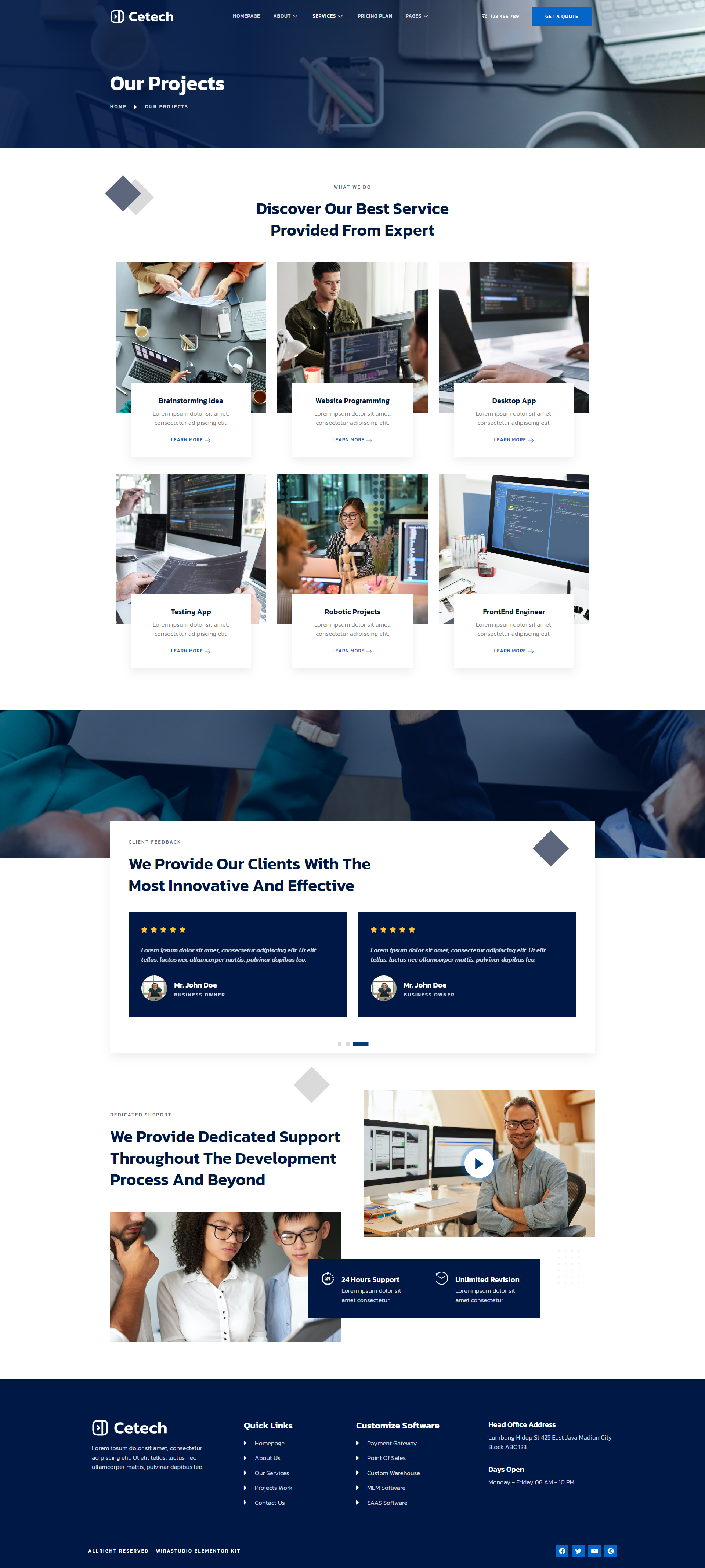 Versatile Sections: From eye-catching hero banners to engaging portfolio layouts, Cetech – Custom Software Development Services Elementor Template Kit includes a variety of sections to showcase your content effectively. Impress your audience with compelling visuals and a user-friendly interface.