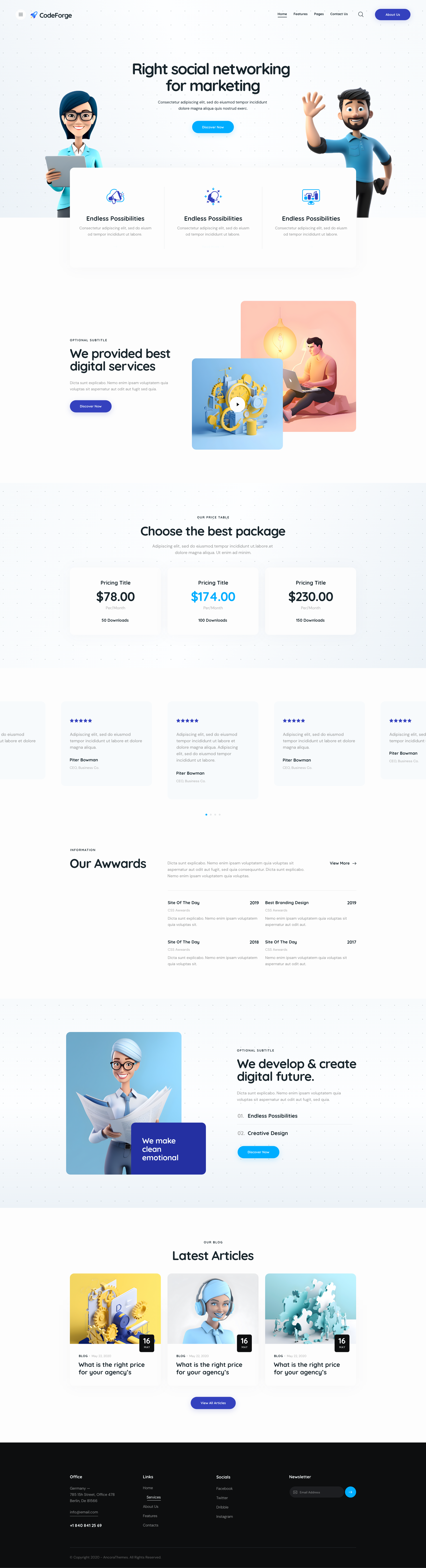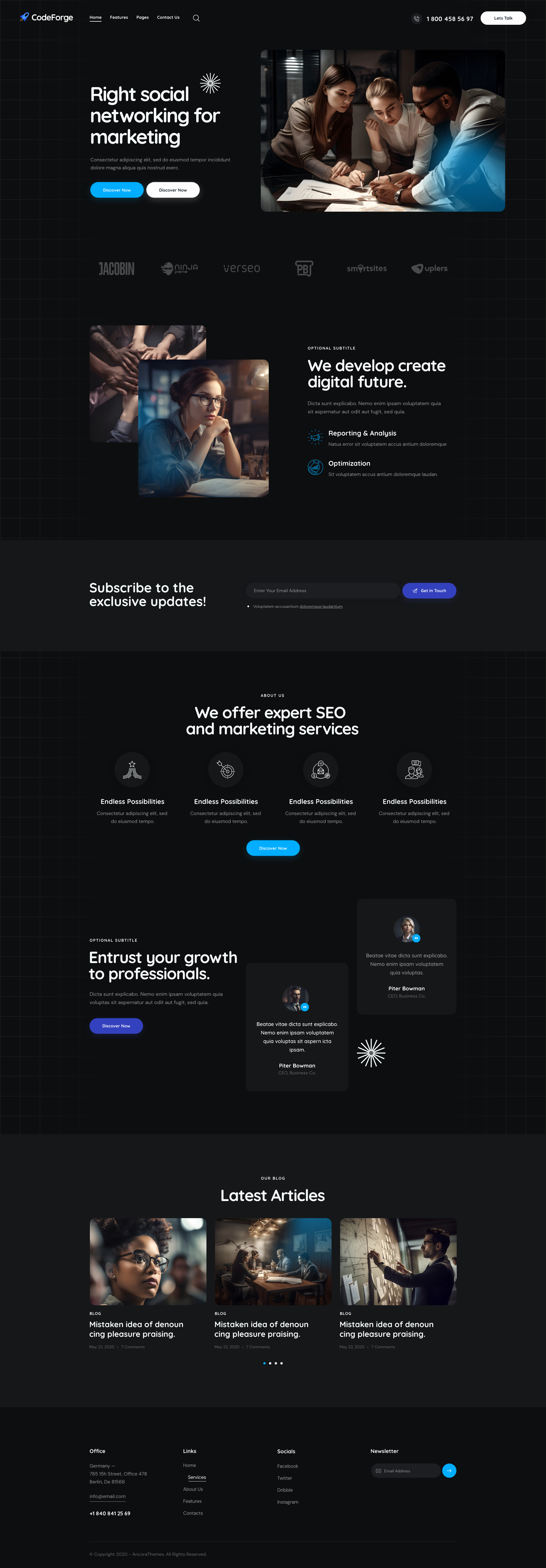 CodeForge is stylish, responsive & modern SEO & Marketing WordPress Theme best suited for a marketing business and advertising firm, web design studio and creative agency, web designer’s portfolio, digital & graphic design. Also it fits website building bureau, corporate mobile application development, project management, entrepreneur, branding & identity, UI/UX Design, single entrepreneur, freelancer, private photographer, creative blog, product design and startup company.