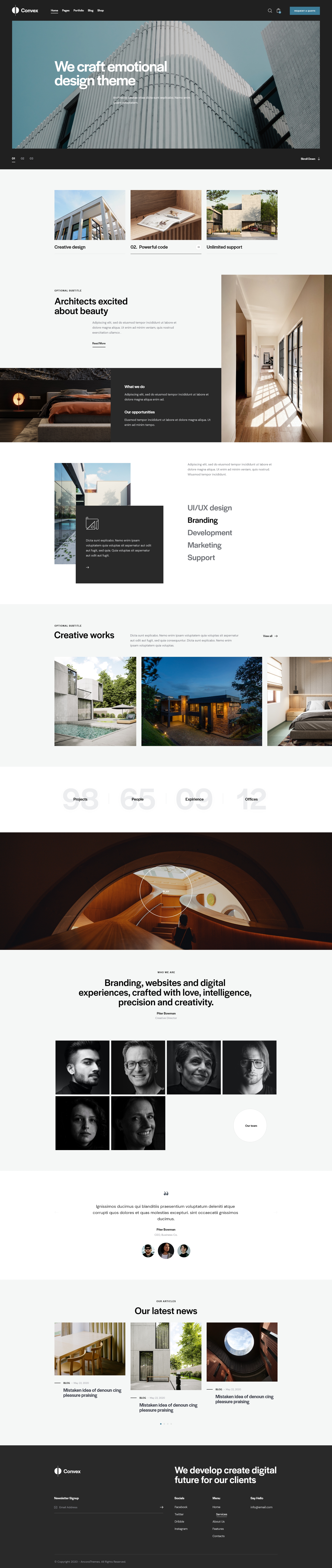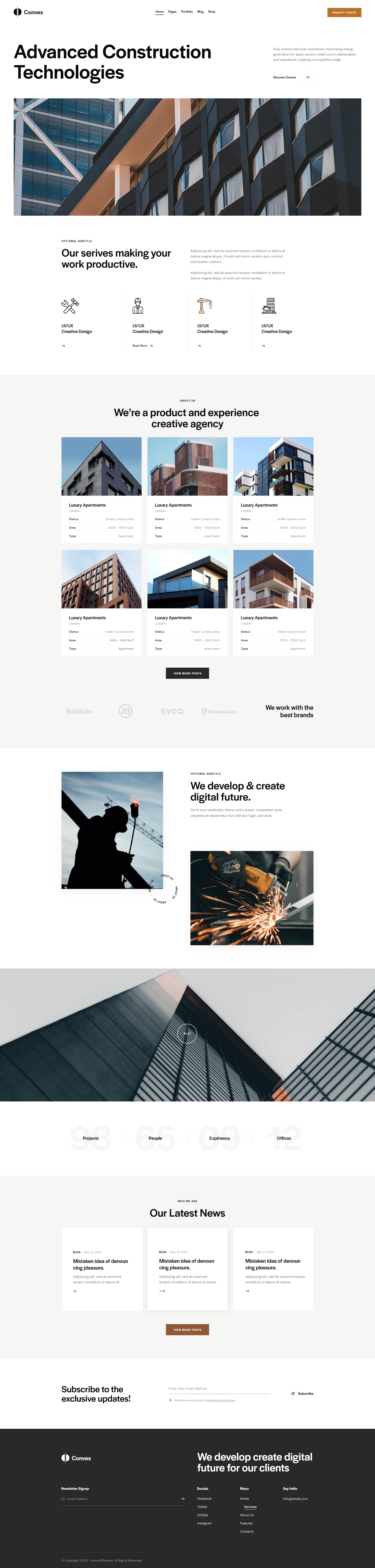 Convex is a modern, contemporary Architecture & Design WordPress Theme fits perfectly for a home repair business agency, home interior design bureau, house renovation and remodeling company, as well as any corporate house maintenance services, such as plumbing, decorating, roofing, carpentry firm, construction & remodeling business, architecture company, etc.