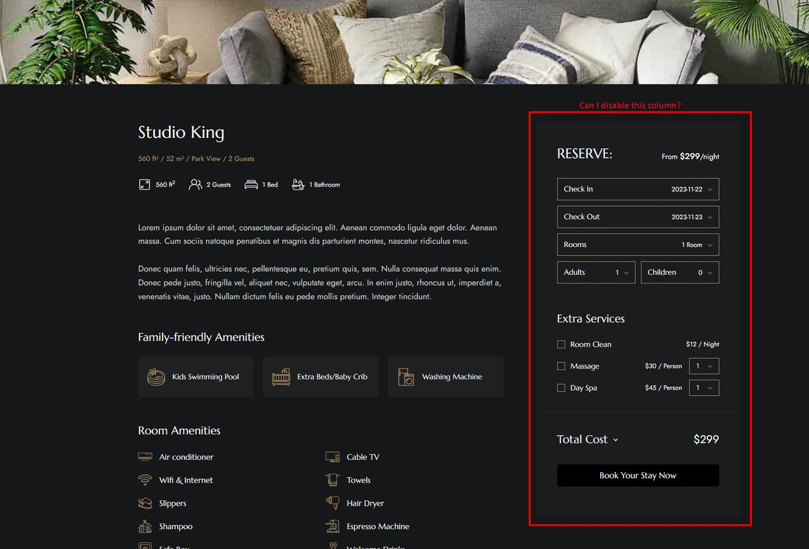 Presales question (City Aparthotel demo): In “Room Details – Top Image” can I disable the right column with the booking? I would like to use only one column with the room details.