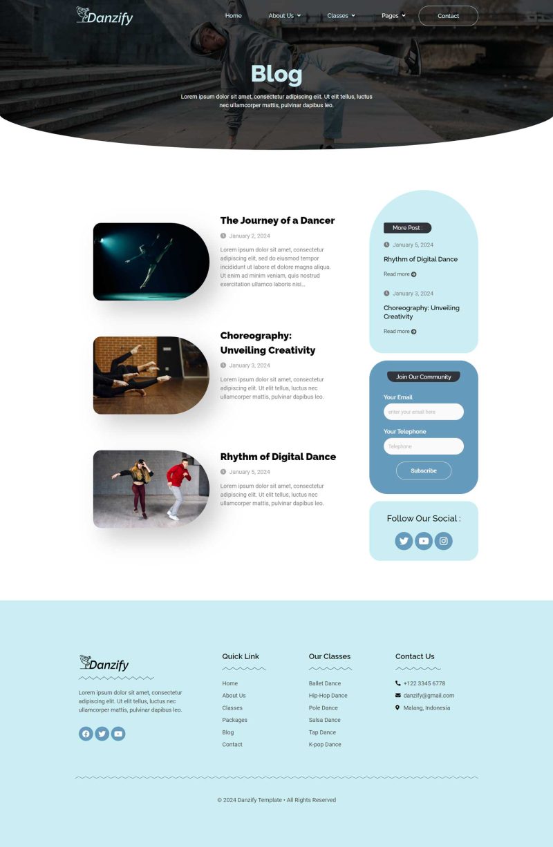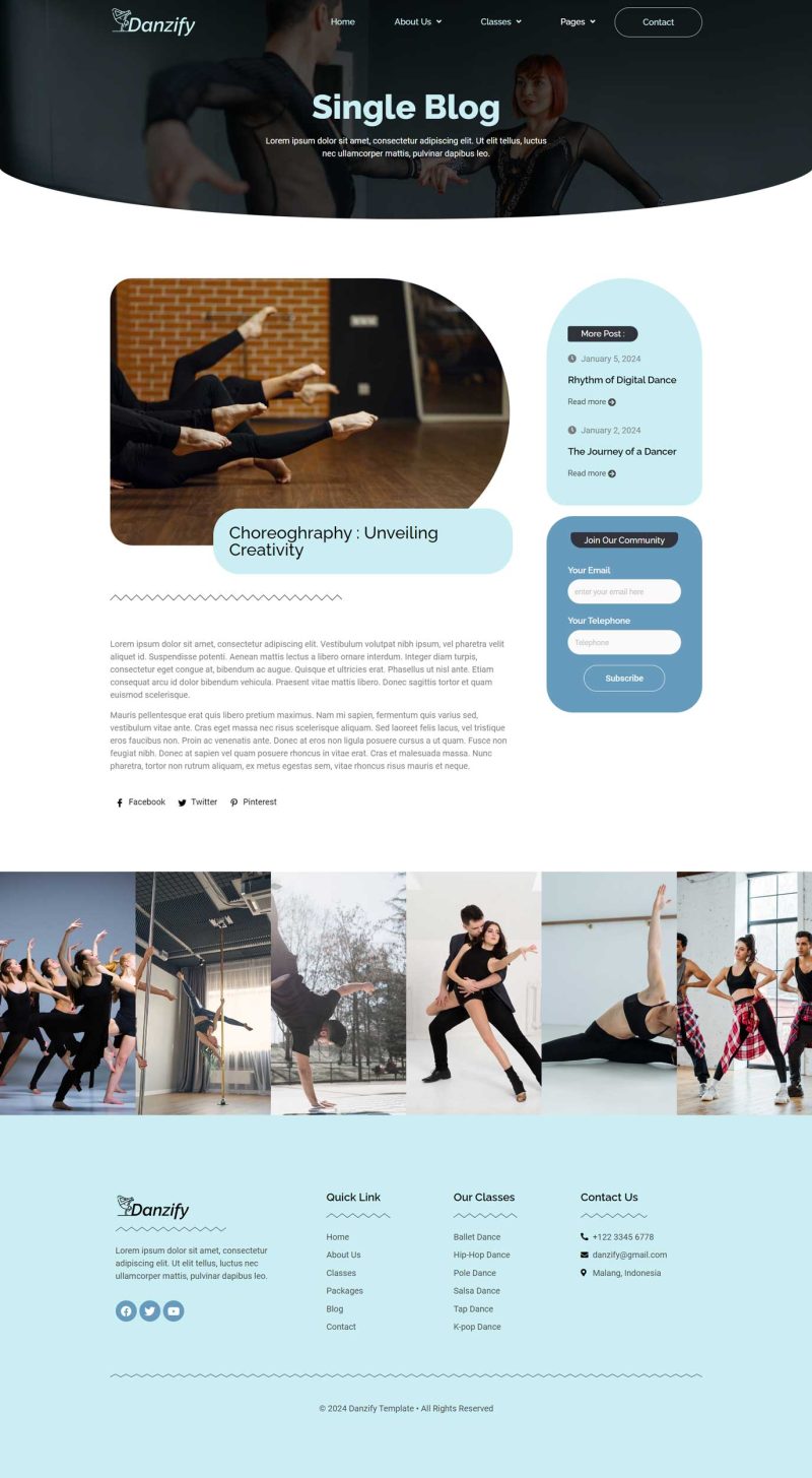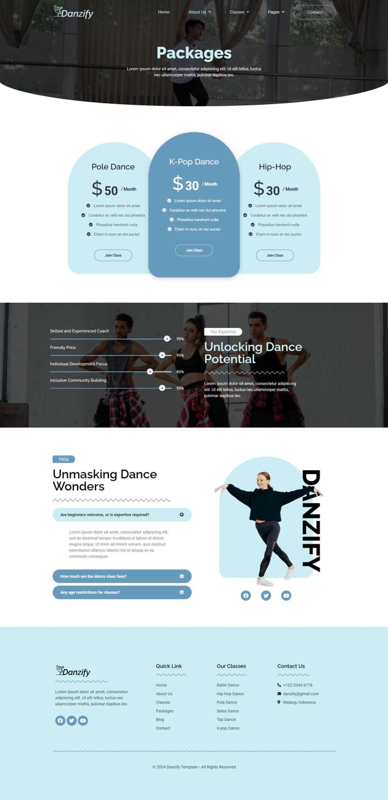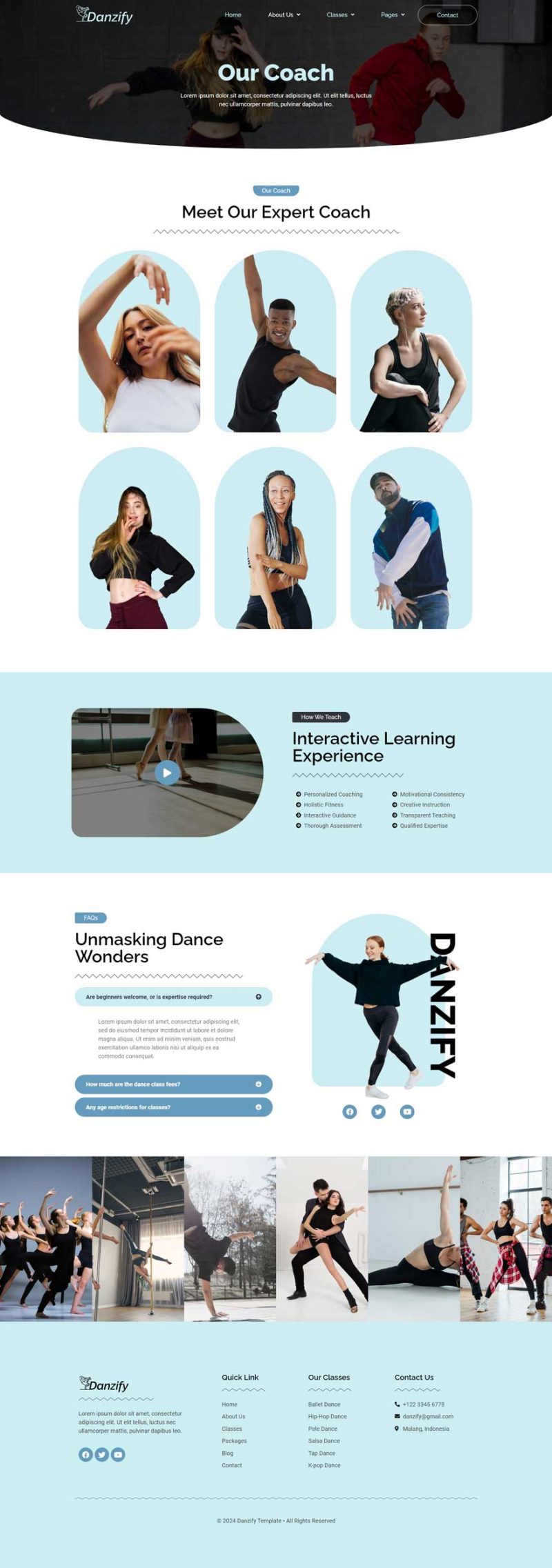 Danzify is an Elementor website template designed specifically for dance studios. This template provides a visually appealing and functional layout, crafted to meet the needs of dance-related websites. With its user-friendly design and compatibility with Elementor, “Danzify” offers a seamless and customizable experience for creating a website that showcases the unique features and services of a dance studio. Danzify provides various pages including Home, About Us, Coach, Classes, Class Detail, Packages, Blog, Single Blog, 404, FAQs, Contact.