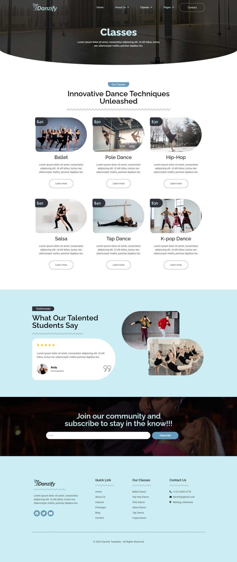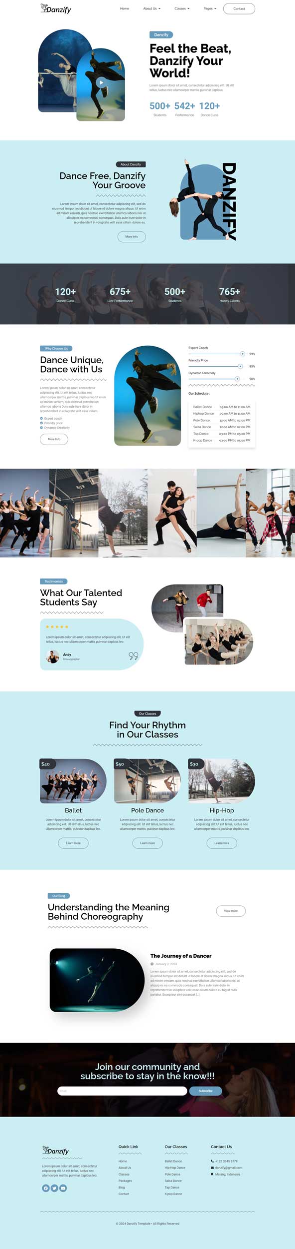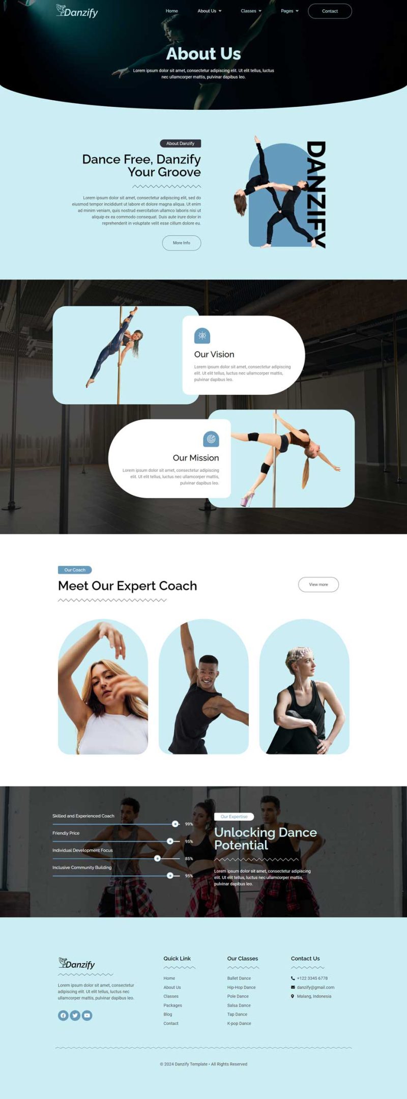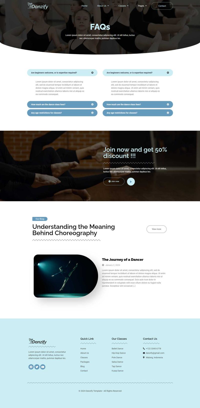 Danzify is an Elementor website template designed specifically for dance studios. This template provides a visually appealing and functional layout, crafted to meet the needs of dance-related websites. With its user-friendly design and compatibility with Elementor, “Danzify” offers a seamless and customizable experience for creating a website that showcases the unique features and services of a dance studio. Danzify provides various pages including Home, About Us, Coach, Classes, Class Detail, Packages, Blog, Single Blog, 404, FAQs, Contact.