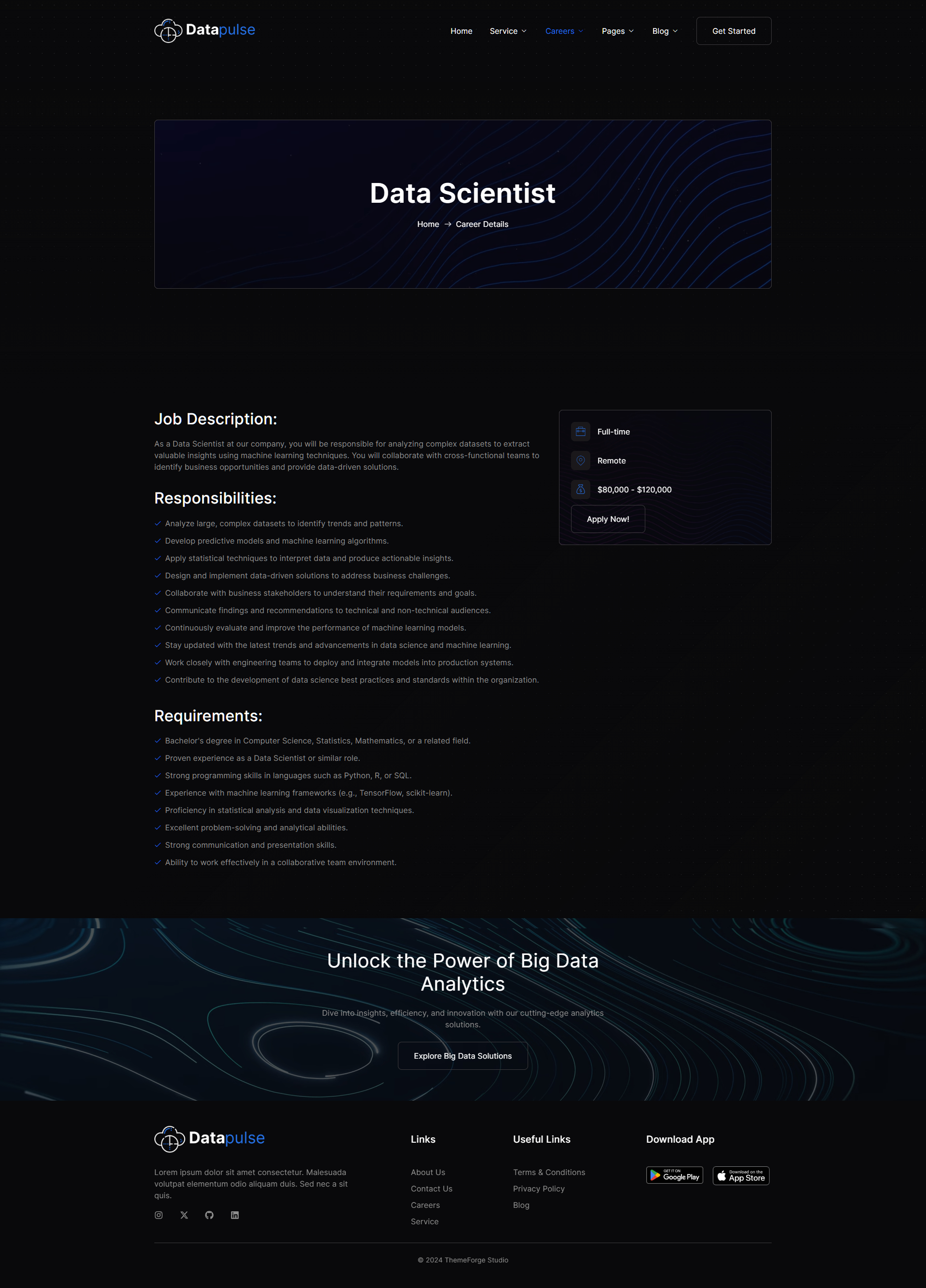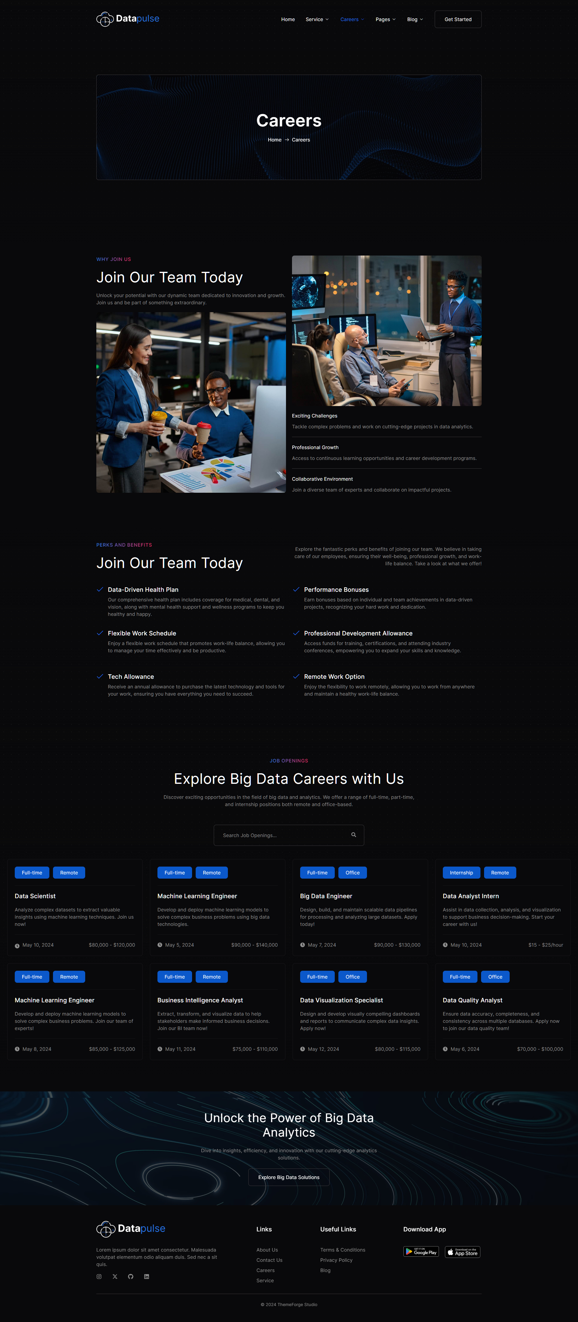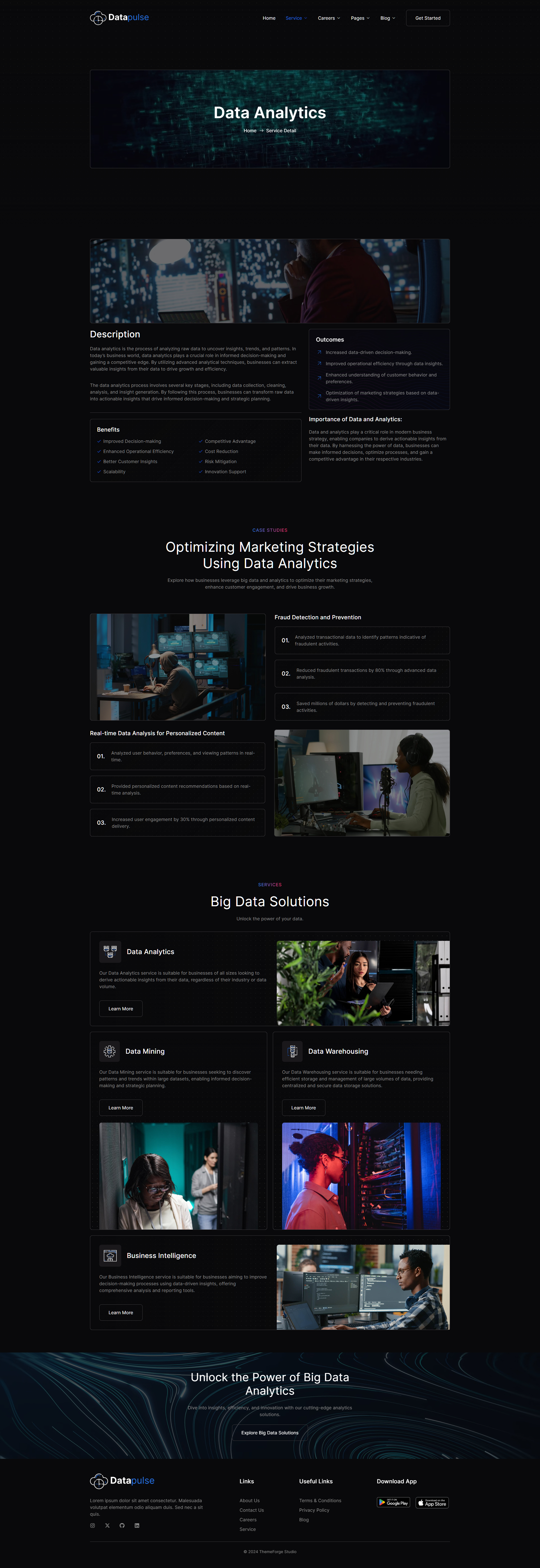 Datapulse is specifically designed to meet the needs of data scientists, analysts, and technology firms focused on Big Data Analytics. Whether you’re presenting complex data sets, detailed reports, or advanced analytics services, this template kit offers the perfect solution. Its sleek, modern design and user-friendly interface ensure that your content is presented in the most engaging and accessible manner possible. The template includes multiple pre-designed pages and sections tailored for showcasing data insights, case studies, team profiles, and service offerings.