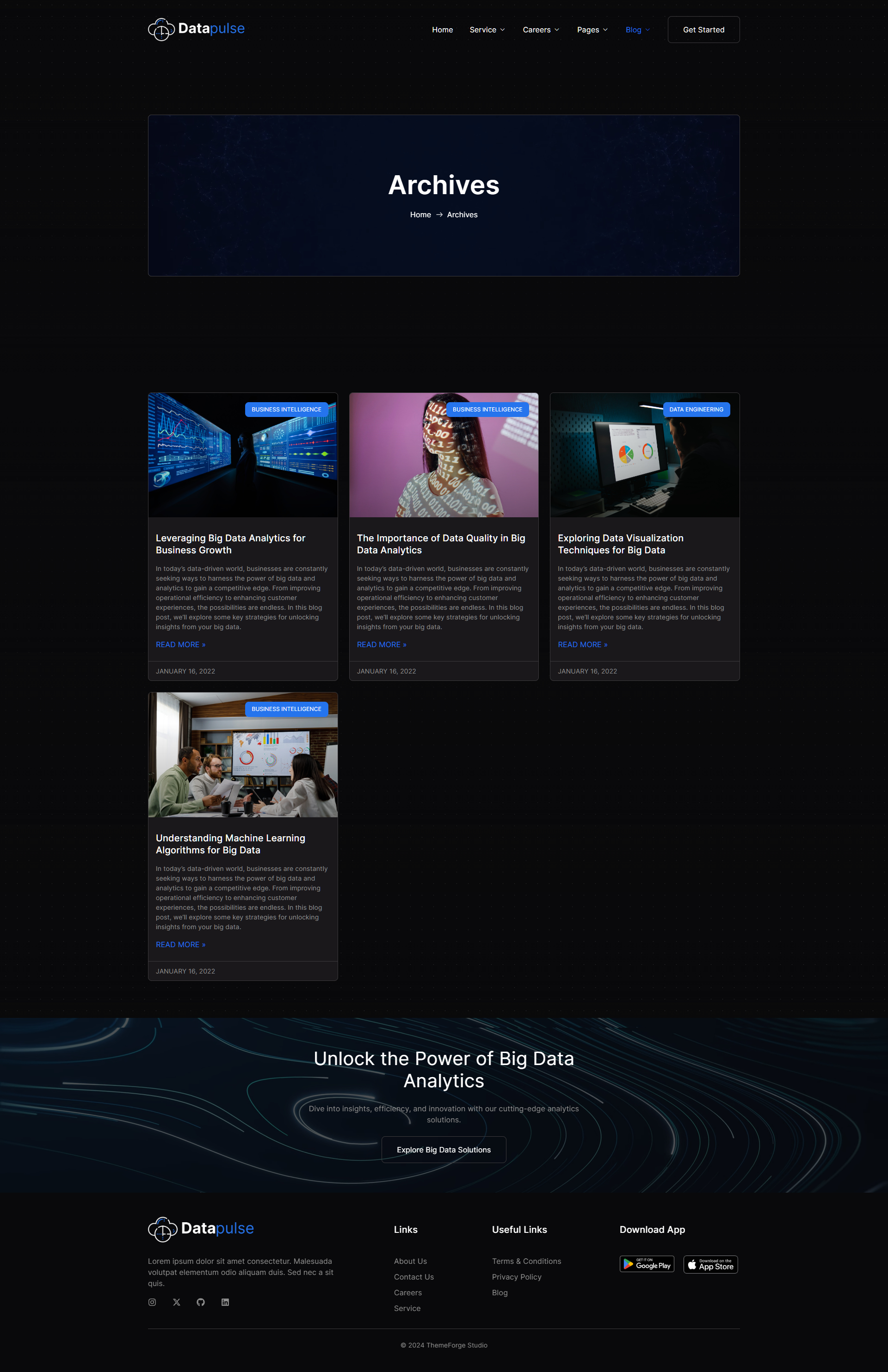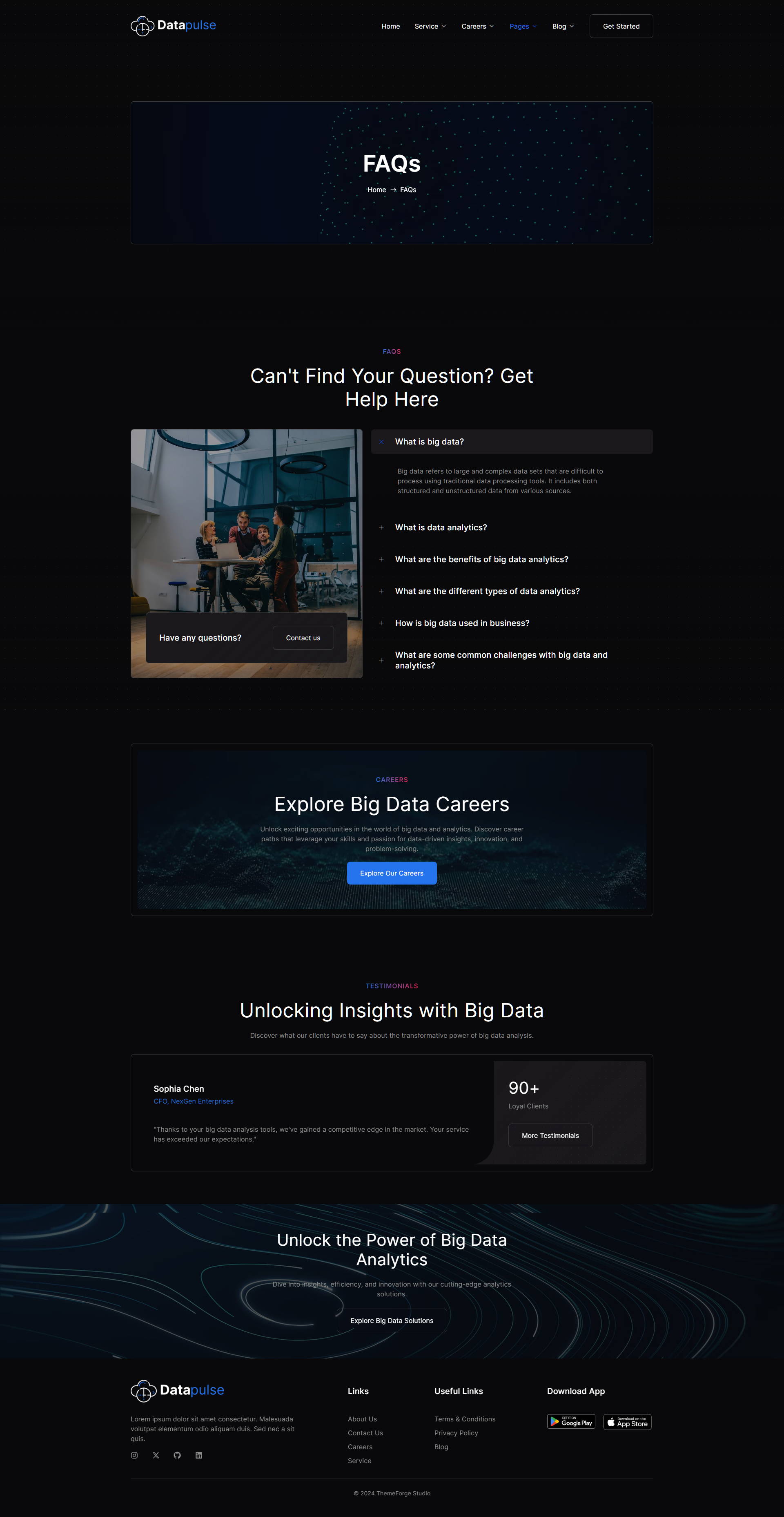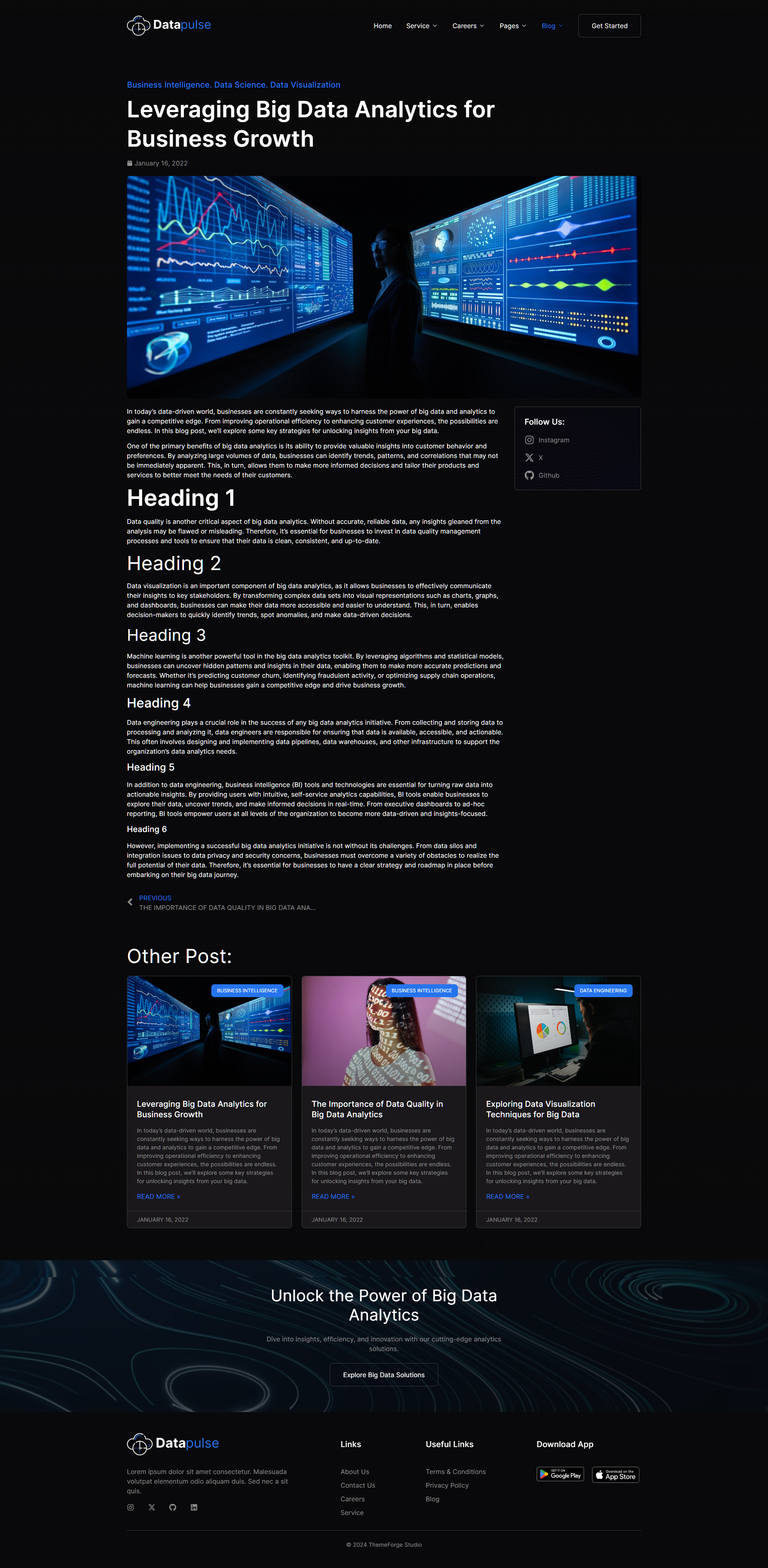 Datapulse is an Elementor Pro template kit designed for the Big Data Analytics domain. Leveraging the power and flexibility of Elementor Pro and WordPress, Datapulse provides a seamless and intuitive website-building experience. With its drag-and-drop functionality and a wide range of customizable widgets, you can effortlessly design a professional website that perfectly reflects your brand’s identity and analytical prowess. Elementor Pro’s advanced features ensure that your site is not only visually stunning but also optimized for performance and responsiveness.