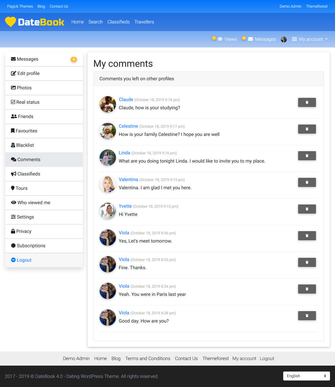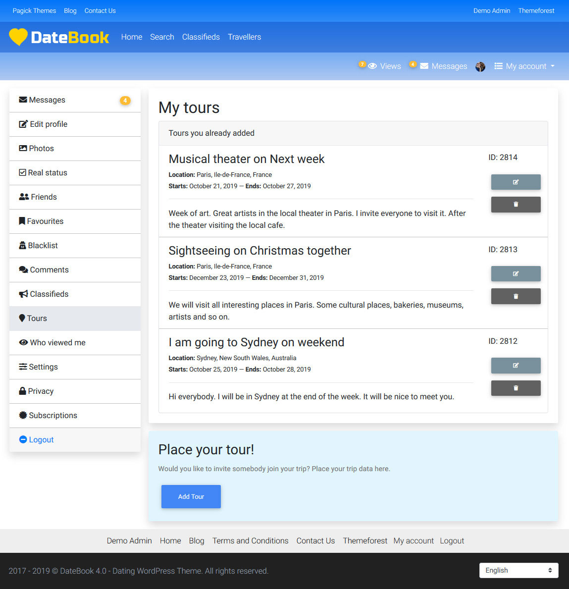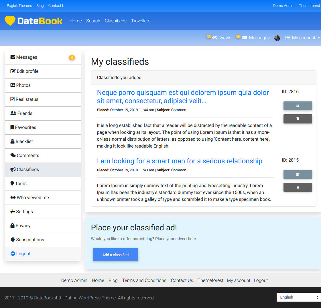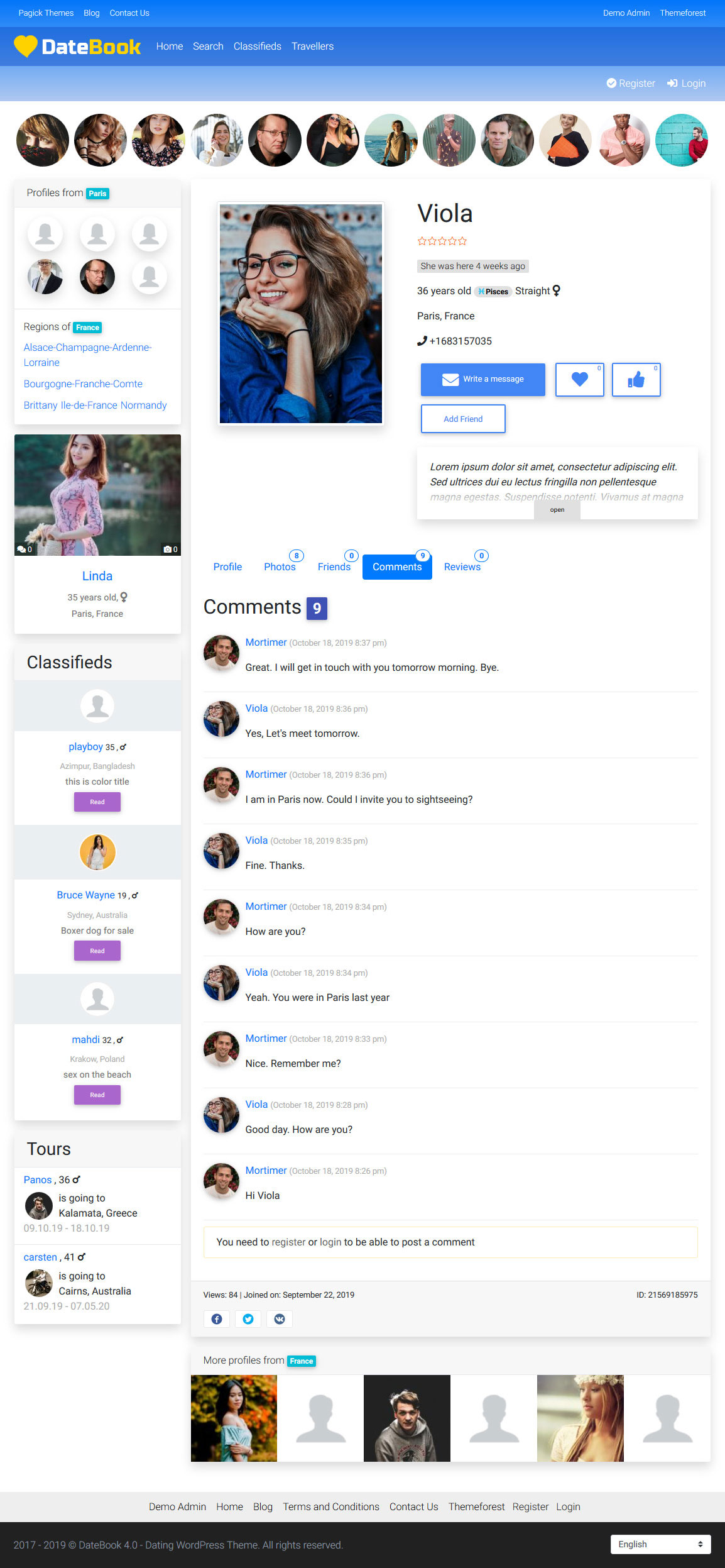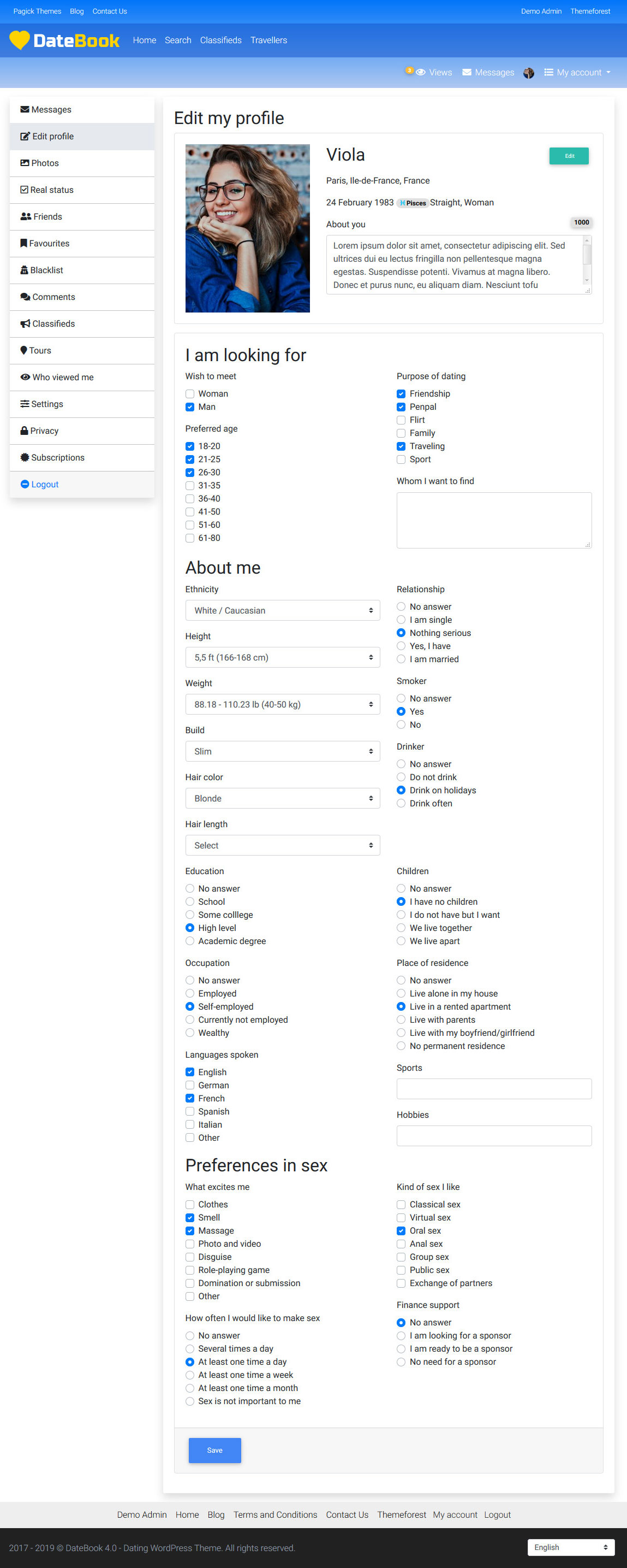 - Updated: Bootstrap updated up to the version 5.3. - Improved: theme settings page saves as ajax. - Fixed: Word Filter did not filter emojis. - Fixed: detection of user's time based on IP was incorrect sometimes. - Fixed: moderation panel wrongly deleted classified ads and tours. - Added: regions in the Related profiles by city widget can be hidden. - Added: confetti effect added to Favorite button. - Fixed: URLs of modified classified ads and tours did not change. - Fixed: shortcode bugs fixed. - Fixed: blog bugs fixed. - Fixed: lots of bugs fixed.