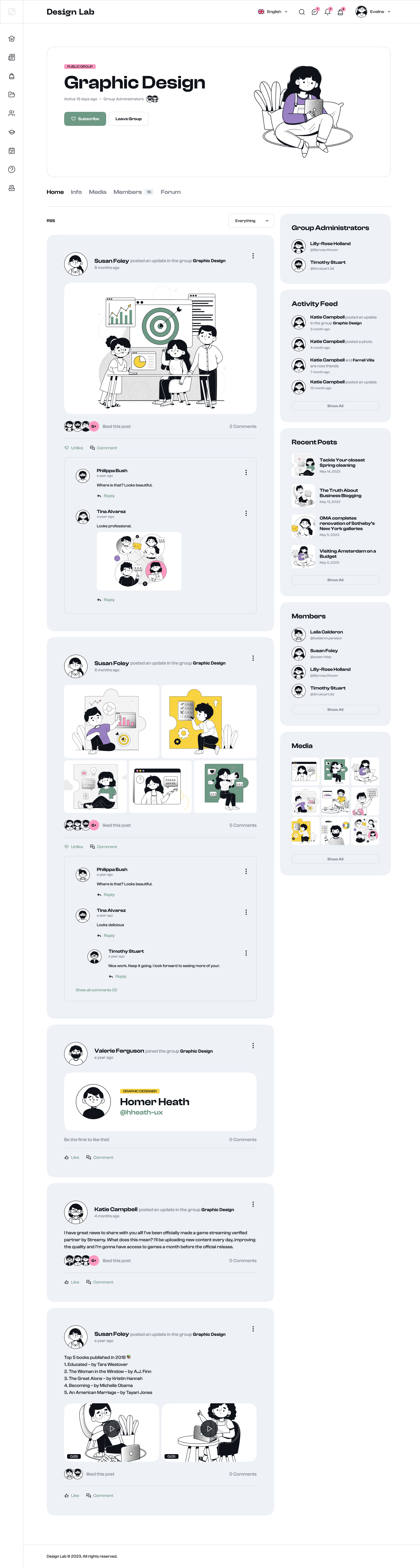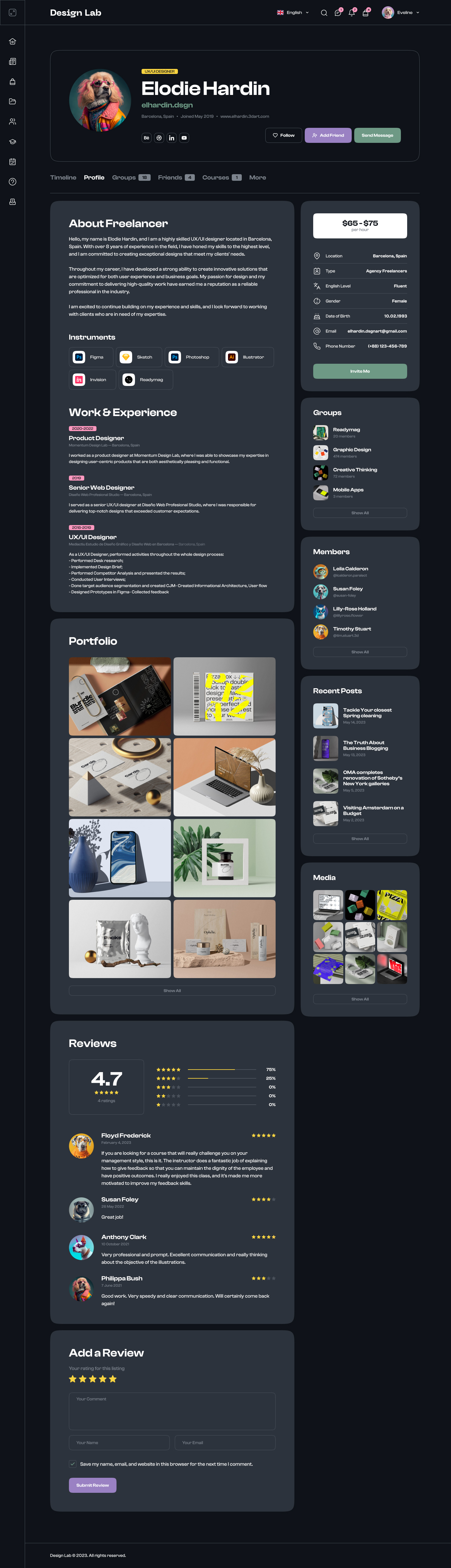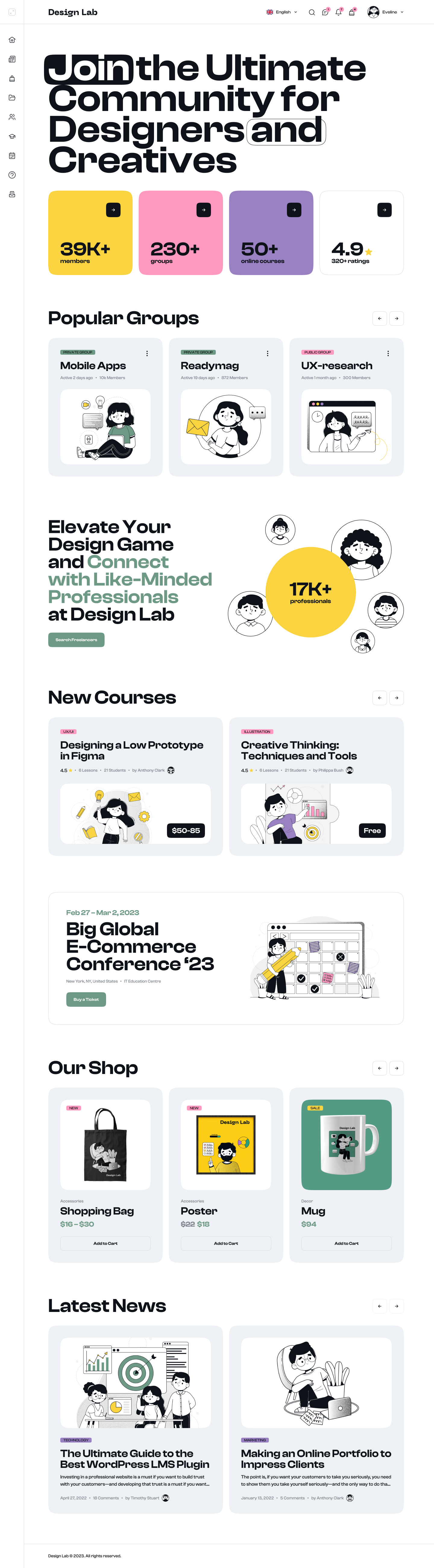 Design Lab is Social Network & Community Figma template for UX/UI Designers, Illustrators, Graphic Designers, 3D Artists and other creators, and freelancers. You can discover the latest web design trends, elevate your design skills with online courses, get inspired and share your portfolio. Large blocks and headers, vibrant colors and smooth UI/UX, fresh display of familiar elements will surely create an experience that your community members will love. The Dark theme is designed using photos, the Light theme is designed using illustrations. This shows the versatility of the template. The Figma Template is built on fullscreen 12-columns grid and it has ready-to-use vector icons and decoration elements. The file contains over 40 pages of built-in components, auto layouts, and variants. We also prepared UI Kit where we put together a design system for your convenience. All layers are properly organized and professionaly crafted so you can easily customize them the way you want.