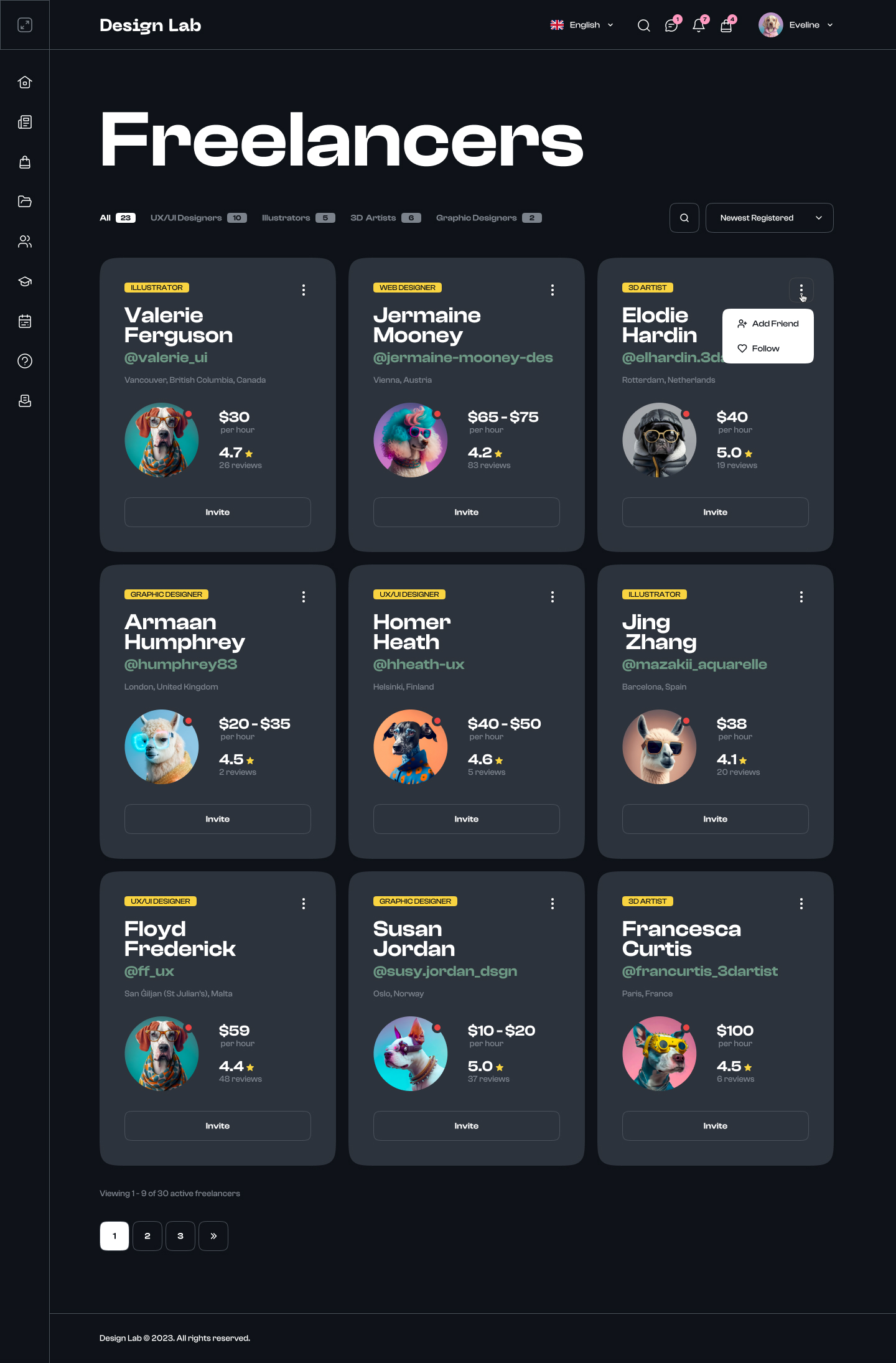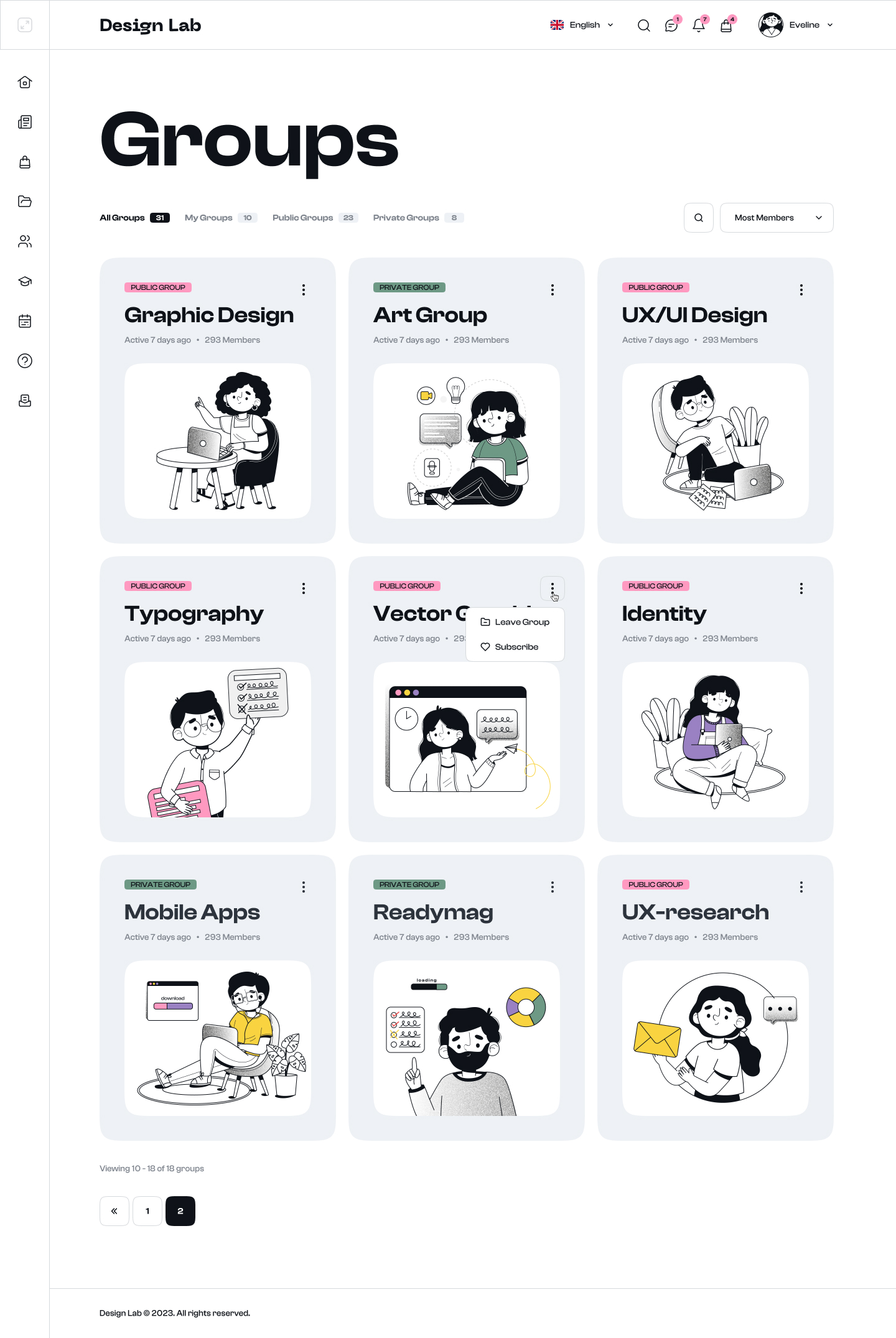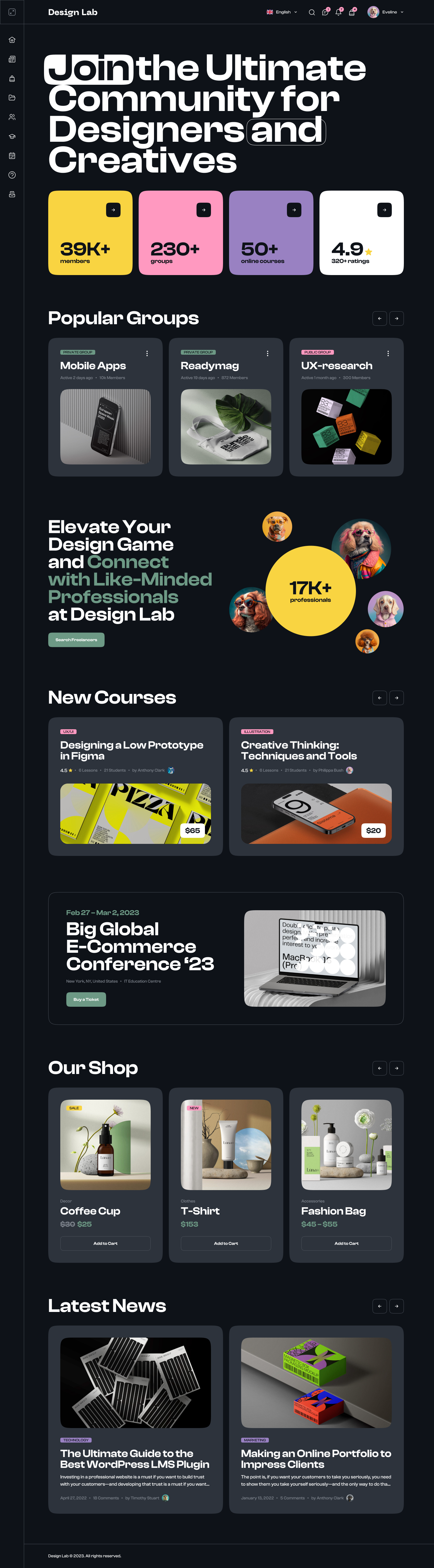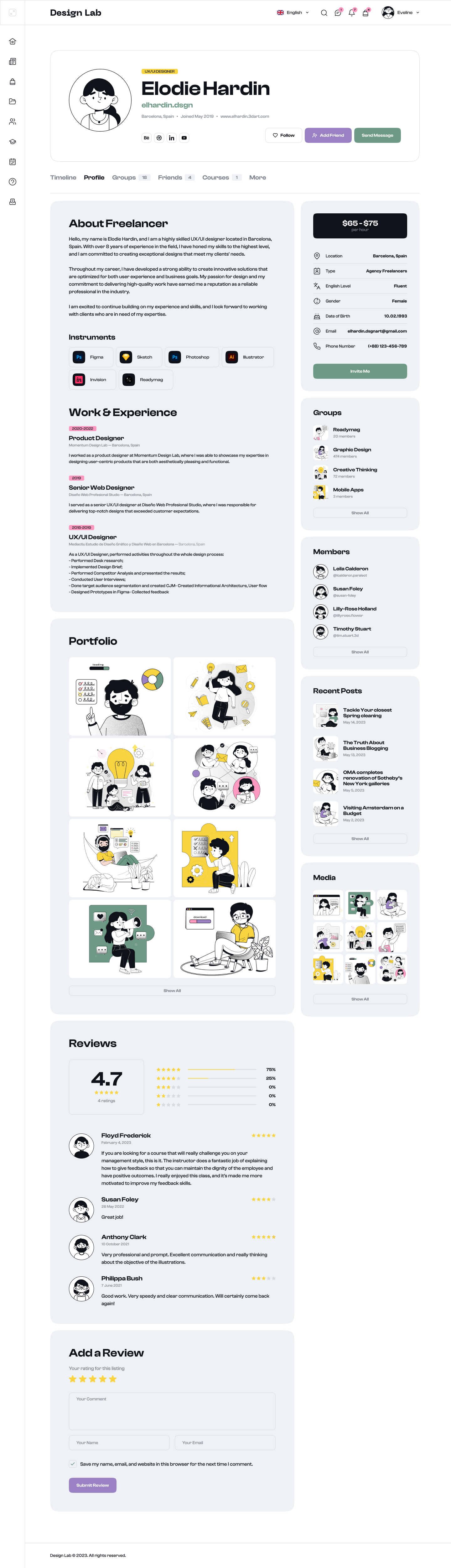 Design Lab is Social Network & Community Figma template for UX/UI Designers, Illustrators, Graphic Designers, 3D Artists and other creators, and freelancers. You can discover the latest web design trends, elevate your design skills with online courses, get inspired and share your portfolio. Large blocks and headers, vibrant colors and smooth UI/UX, fresh display of familiar elements will surely create an experience that your community members will love. The Dark theme is designed using photos, the Light theme is designed using illustrations. This shows the versatility of the template. The Figma Template is built on fullscreen 12-columns grid and it has ready-to-use vector icons and decoration elements. The file contains over 40 pages of built-in components, auto layouts, and variants. We also prepared UI Kit where we put together a design system for your convenience. All layers are properly organized and professionaly crafted so you can easily customize them the way you want.