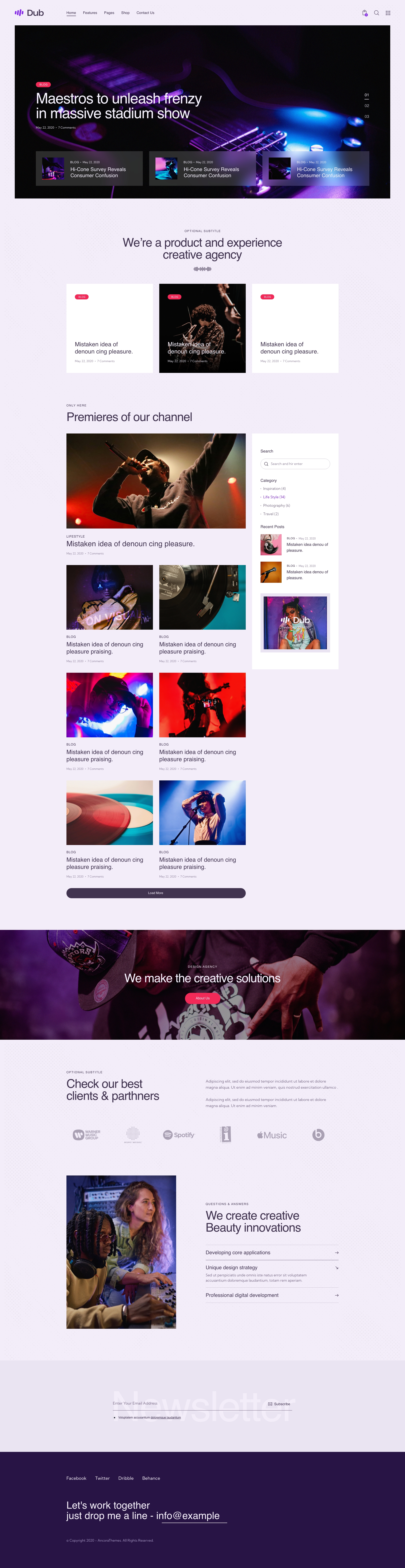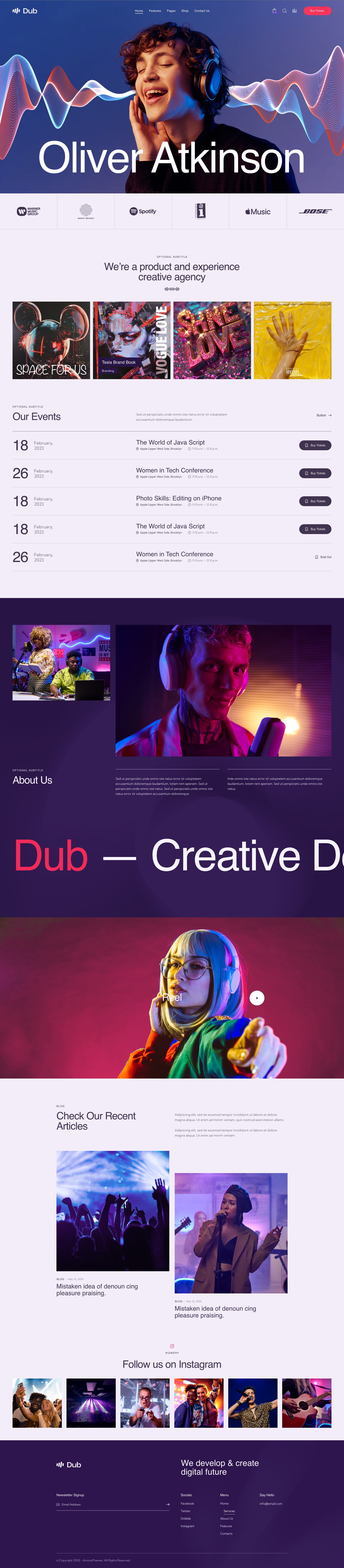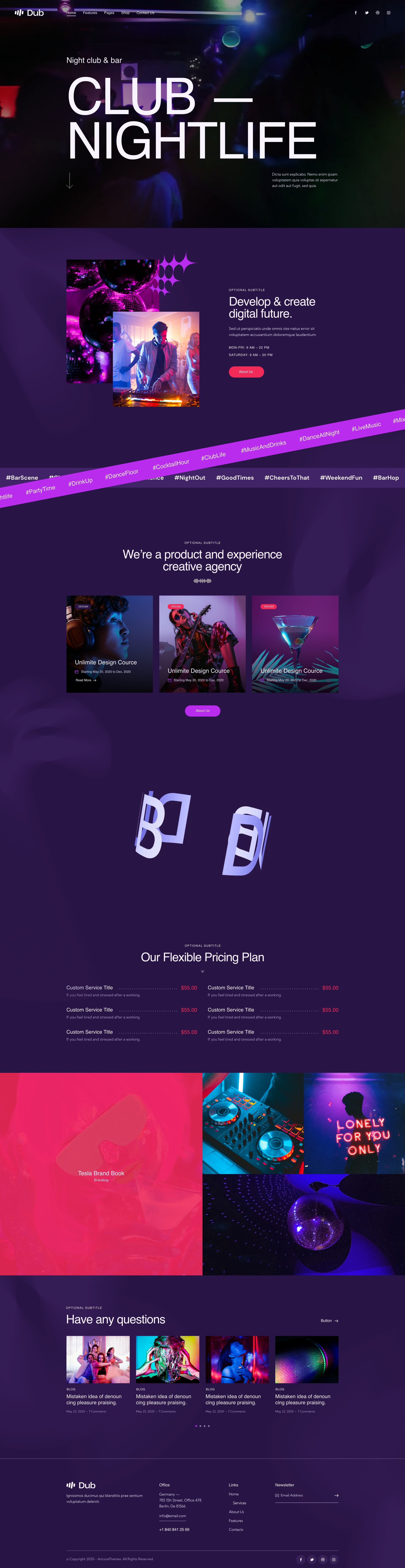 Dub is good for a Concert, Music Festival & Night Club, WordPress Theme with a modern festive design. It was developed specifically for Open Mic Event, Stand-up Concert, Stand-up Artist, Night Club. Also, it fits lounge bars, any event or party website. It can be used for showcasing your DJ, or musician career and can also be interesting for club music fans.