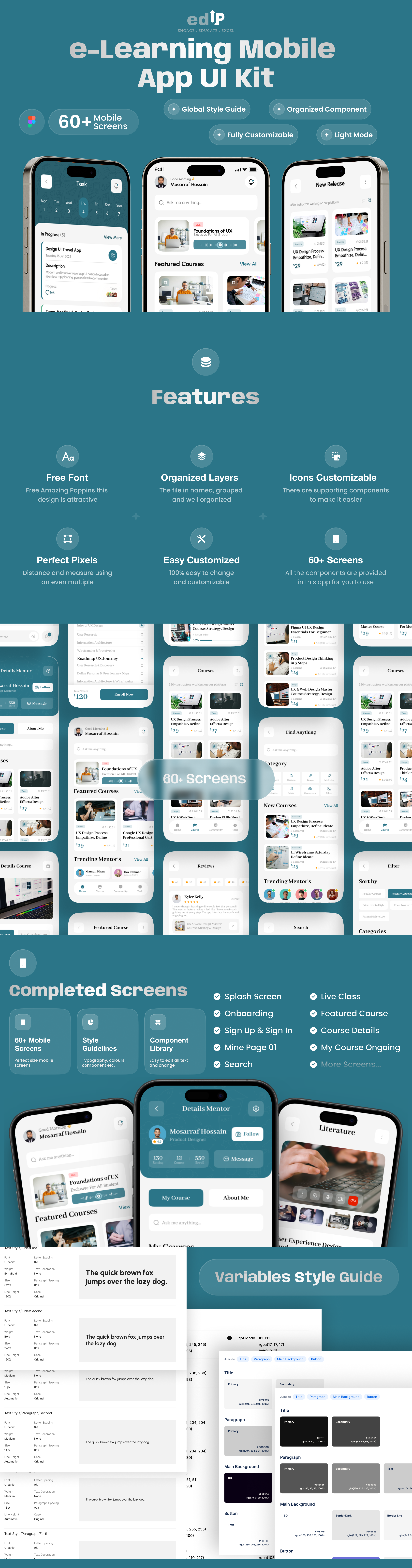EduUp – e-learning Mobile App UI Kit consisting of 60+ pixel-perfect screens and easy to use. The kit is easy to fully customize to your liking and it leverages all features, including global color, font styles, dynamic components & variants. Whether you’re creating a language learning platform, online course app, school management tool, or tutoring service — EduUP has you covered.It provides a seamless learning experience with a clean, elegant, and user-friendly interface. This UI kit includes 60+ high-quality mobile screens designed for iOS and Android, with a clean and consistent layout, bold typography, and engaging visuals that drive learning retention. All components are fully customizable, well-layered, and built with design systems and auto-layout for quick workflow.. We create version figma file, so it’s really easy to editable. Easy to use and screens is ready to use for iOS & Android app. You can easily change any design. It’s easy to customize and also well documented.