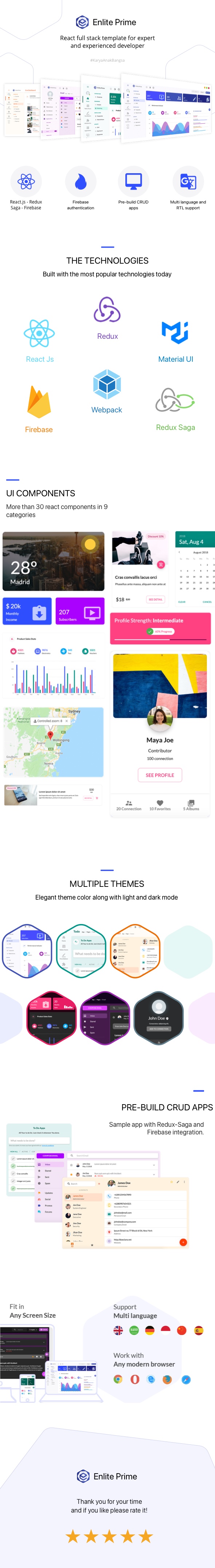 Version 2.2.3 – 7 May, 2025 - Feature: Auto-copy assets images and favicons to build production folder - Fixed: Image Placeholder domain Version 2.2.2 – 18 Mar, 2025 - Docs: Add Redux Toolkit documentation for Sample Firebase App - Fixed: Fixed list sidebar on safari Version 2.2.1 – 14 Oct, 2024 - Fixed: Login with firebase issue Version 2.2.0 – 19 Aug, 2024 - Chore: Upgrade to Redux Toolkit - Chore: Change Redux Form to Formik - Chore: Change Redux Saga to Redux Toolkit Query Version 2.1.0 – 2 Jul, 2024 - Chore: Update version for Webpack and another packages - Chore: Upgrade react-router-dom v6 Version 2.0.4 – 11 Mar, 2024 -Feature: Create unlimited menu level for sidebar Version 2.0.3 – 17 Sep, 2023 - Chore: Remove Hidden deprecated MUI component Version 2.0.2 – 12 Mar, 2023 - Fixed: Sidebar Mini UI Issue Version 2.0.1 – 12 Feb, 2023 - Fixed: Responsive Issue Version 2.0.0 – 6 Feb, 2023 - Feature: Add Service Worker - Chore: Upgrade to Material UI 5 and React 18 ... See the rest change log in docs Version 1.0 – 13 May, 2019 - Enlite Prime released