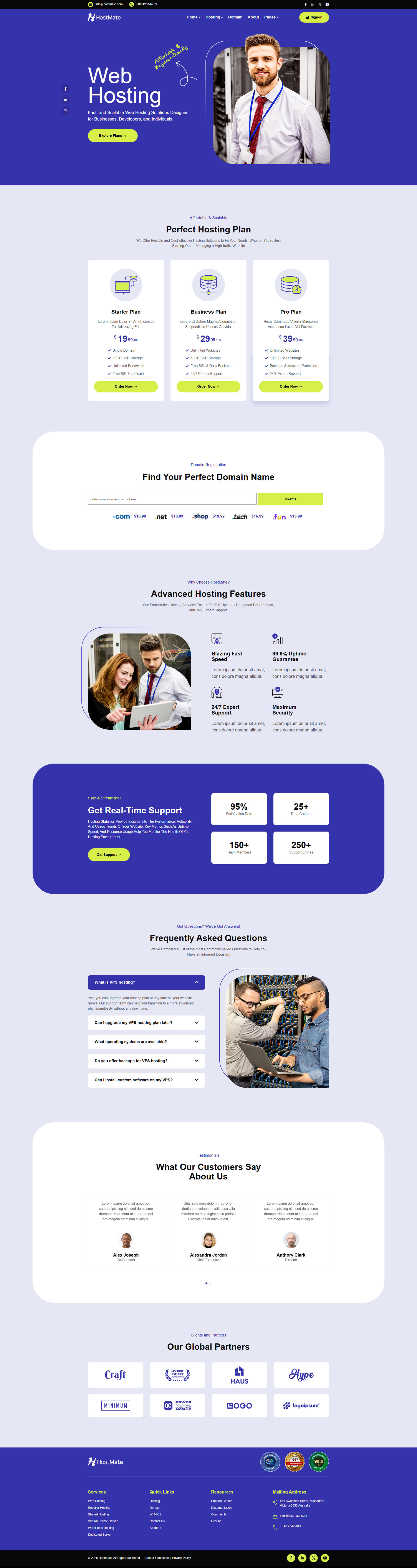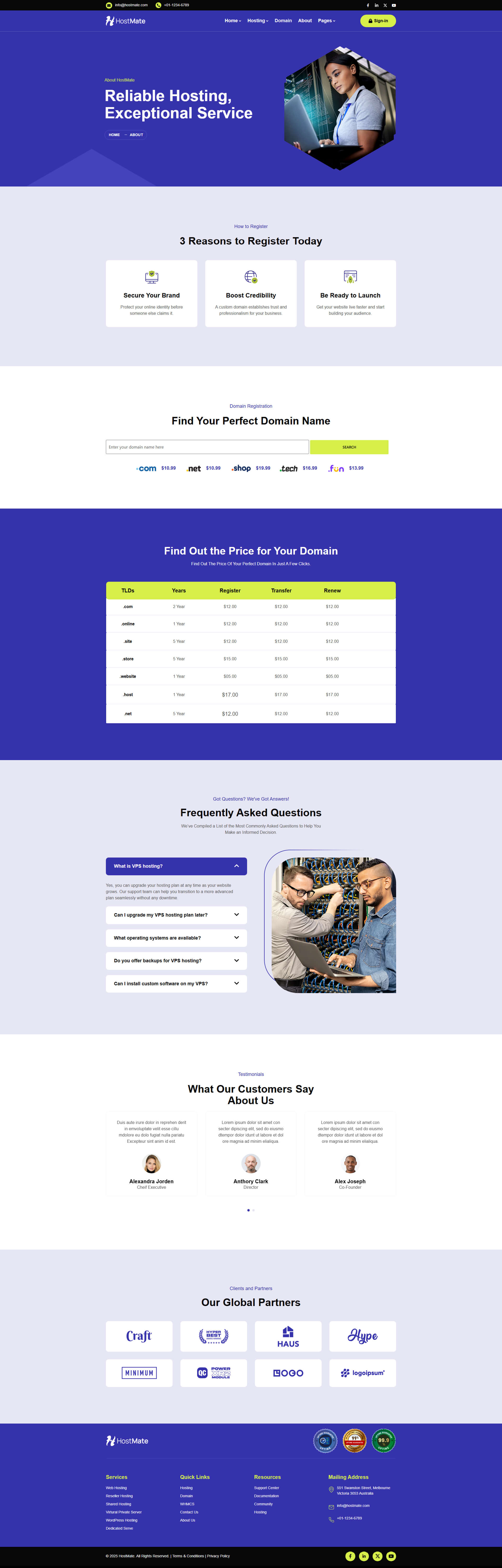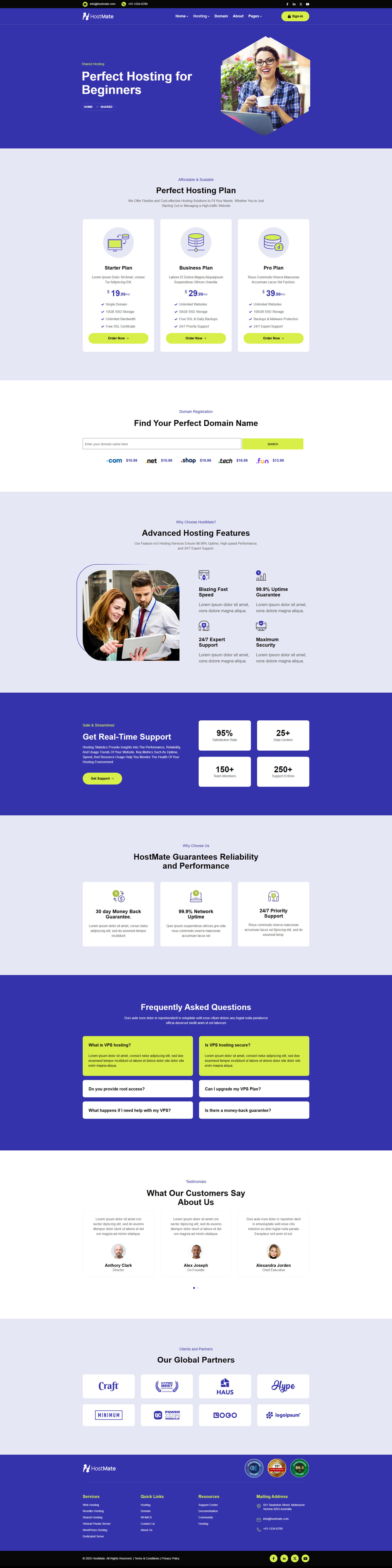 Created to showcase hosting plans, cloud solutions, domain management tools, and customer testimonials, HostMate includes professionally crafted templates and versatile UI components tailored to the hosting industry. With dedicated sections for pricing tables, service comparisons, support content, and more, setting up your website is simple and effective.