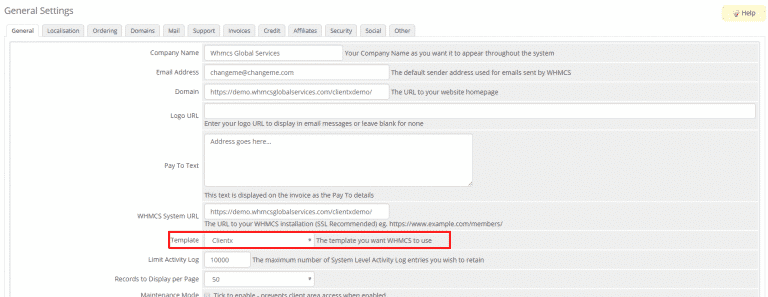 Step 4: Log in to WHMCS admin and Now go to Setup > General Settings > Template and select the “HostSite” template from the list https://whmcsglobalservices.com/wp-content/uploads/2020/02/WHMCS-General-Settings-768x297.png