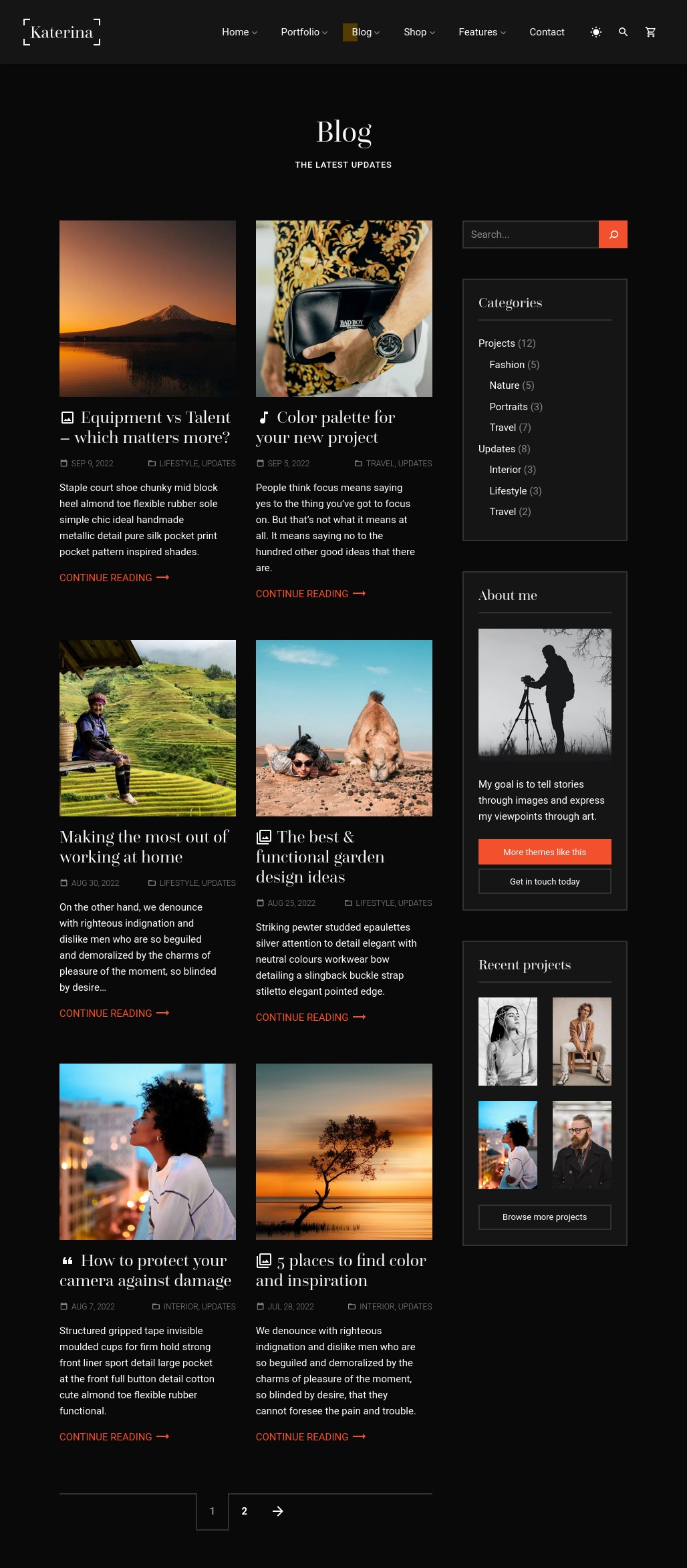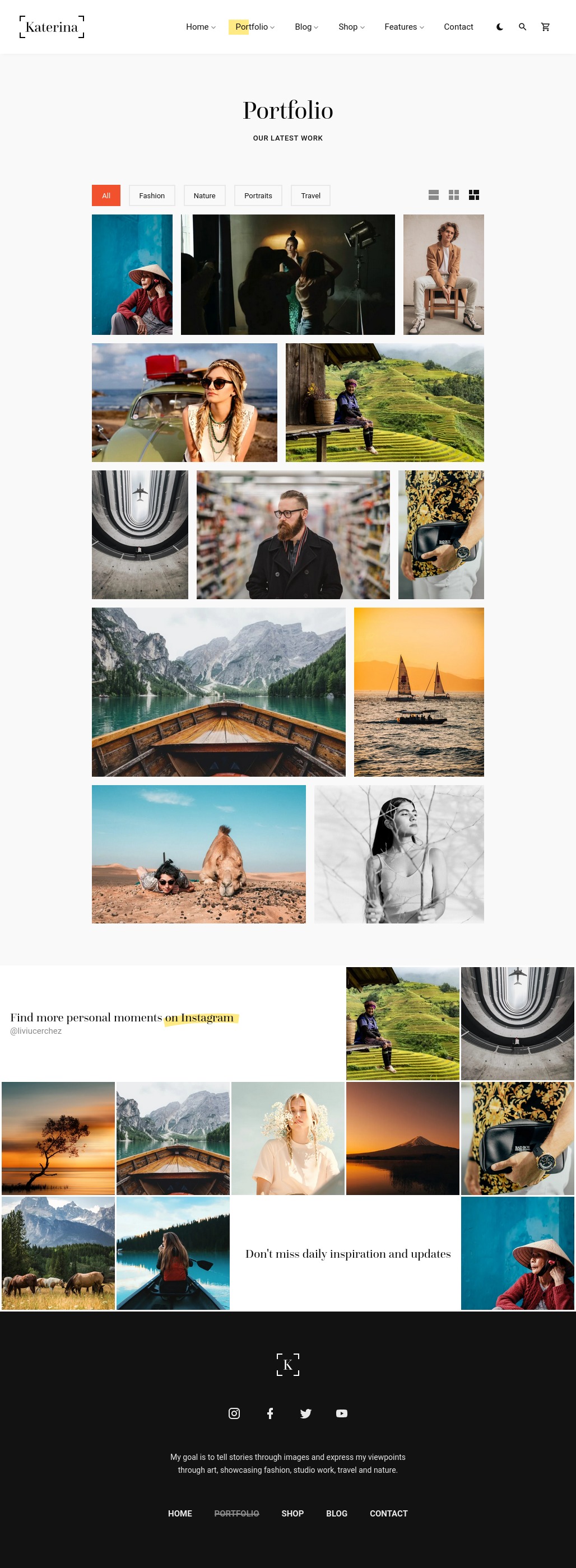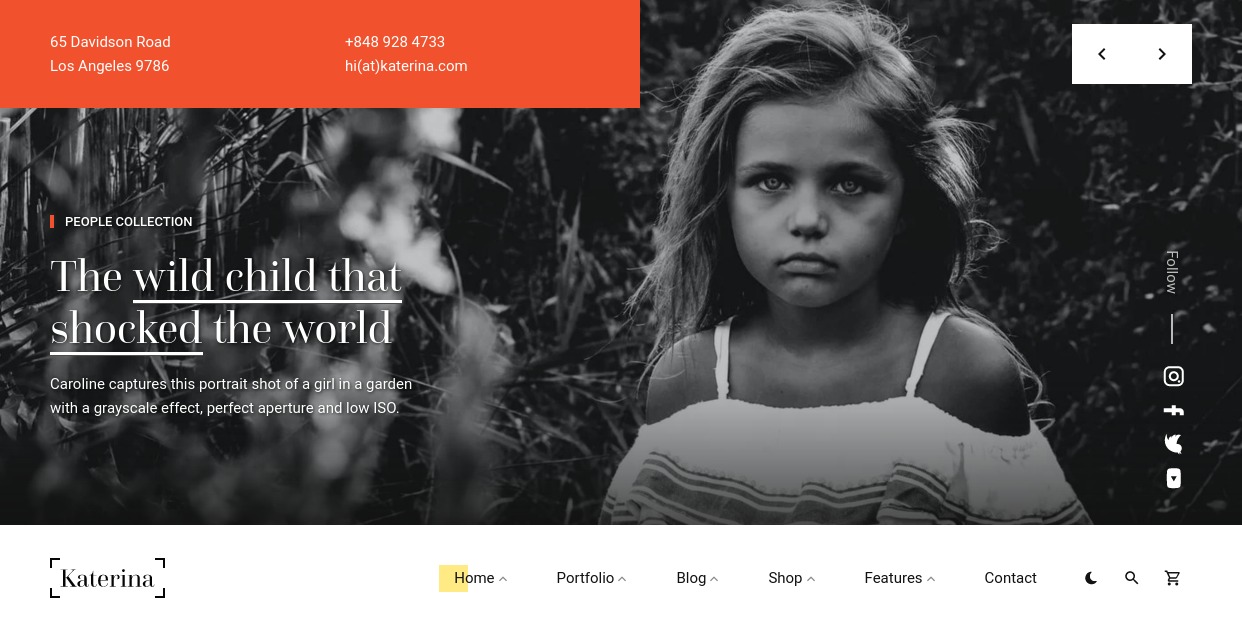 Katerina is a premium photography and portfolio theme designed to load quickly, easy to use with the wow factor of a unique displacement slider, parallax media, panoramic experience and built-in portfolio gallery features.