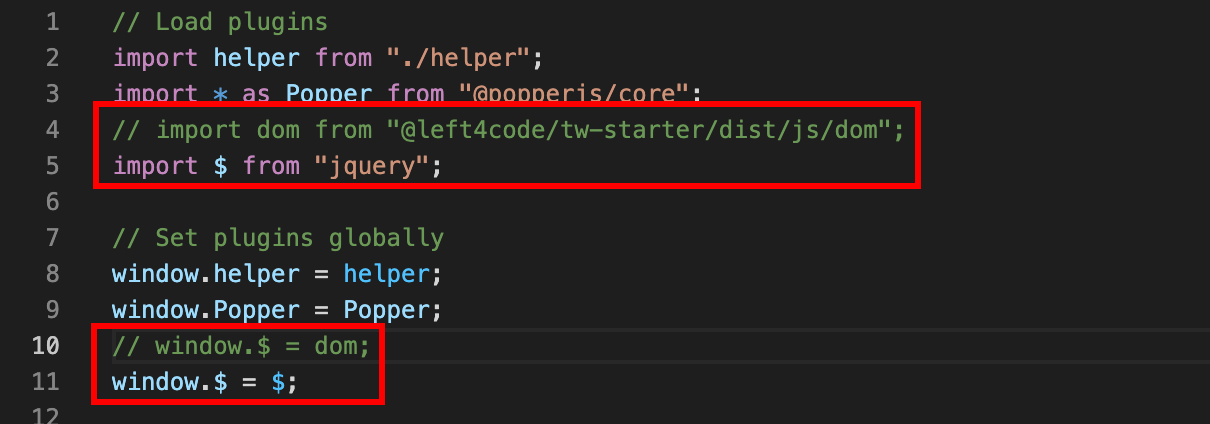 After installing jQuery in your project, open this file ”/src/js/bootstrap.js”, and update these lines to change our built-in `dom` library with jquery.