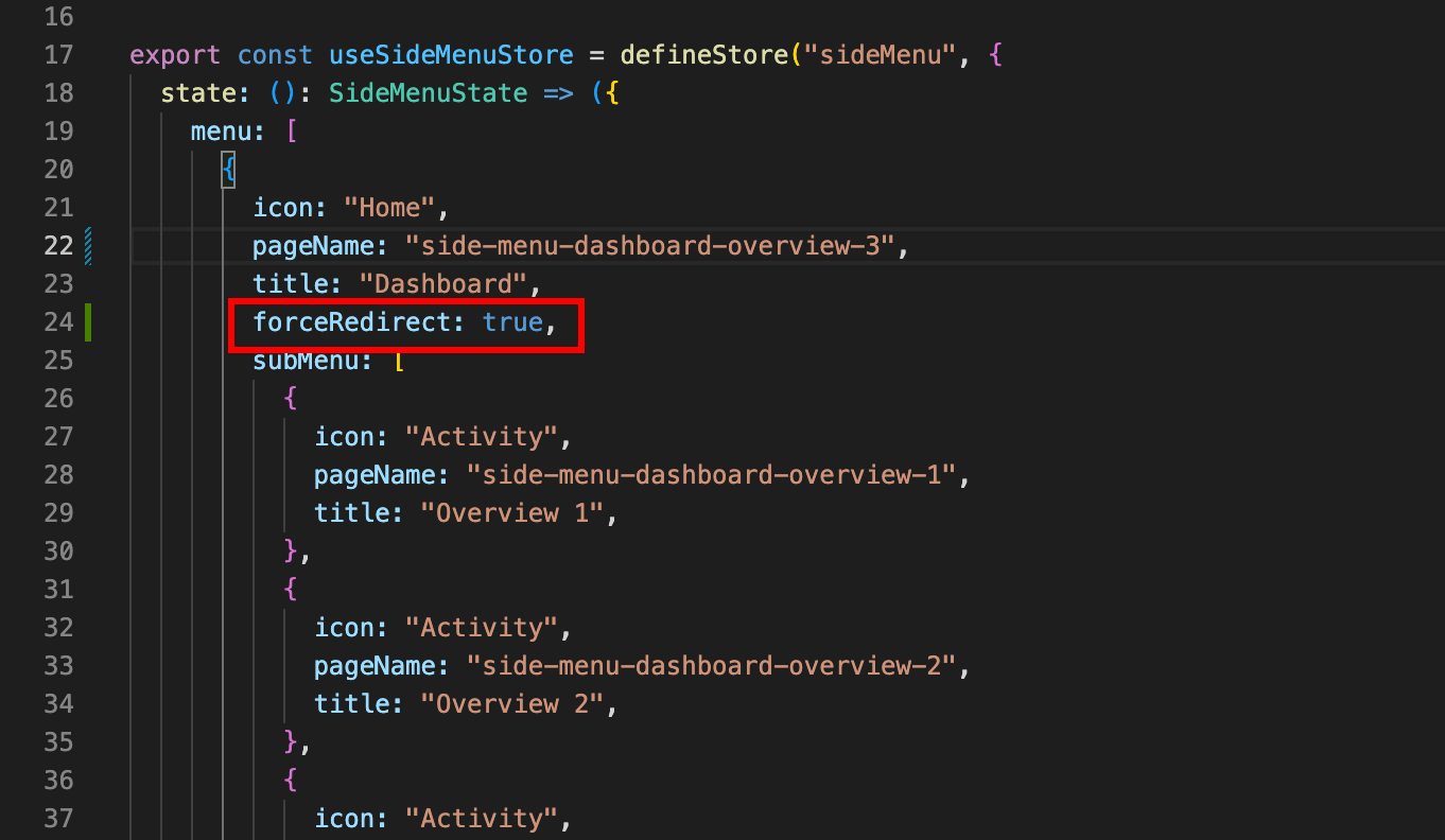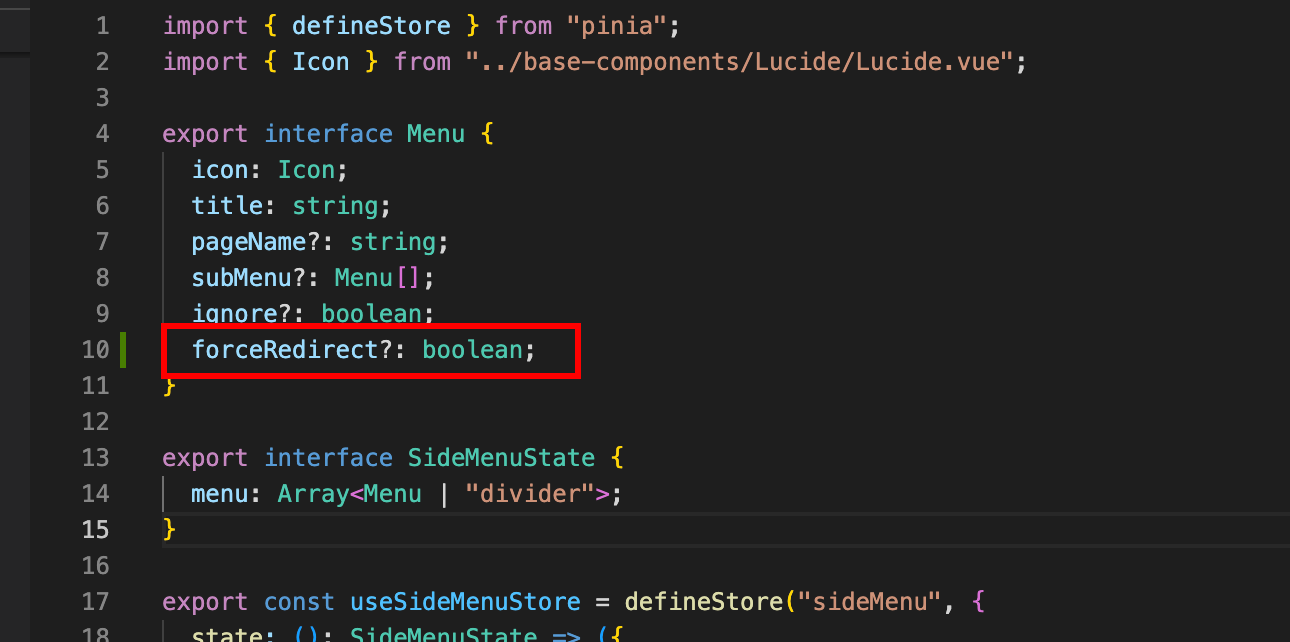 First, let’s open the file located at ”/src/stores/side-menu.ts”. Inside that file, add the following line of code: