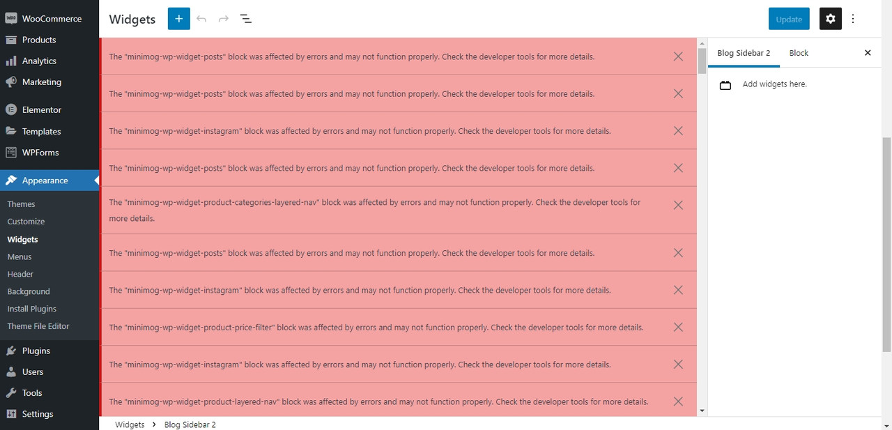 The widget area setting is also broken. It has so many errors that I can not use to edit the widgets.