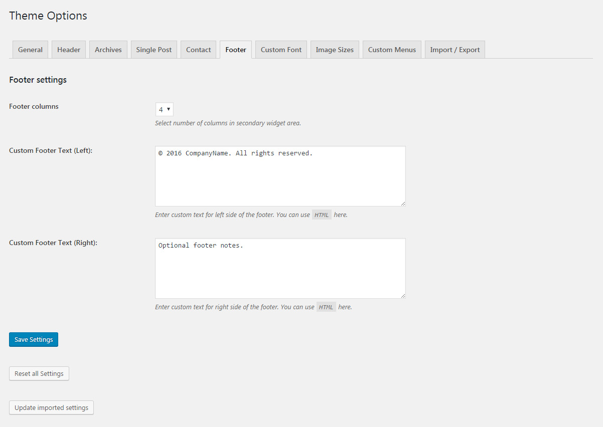 - Up to 6 secondary widget columns before footer (Number of columns can be set from theme options)