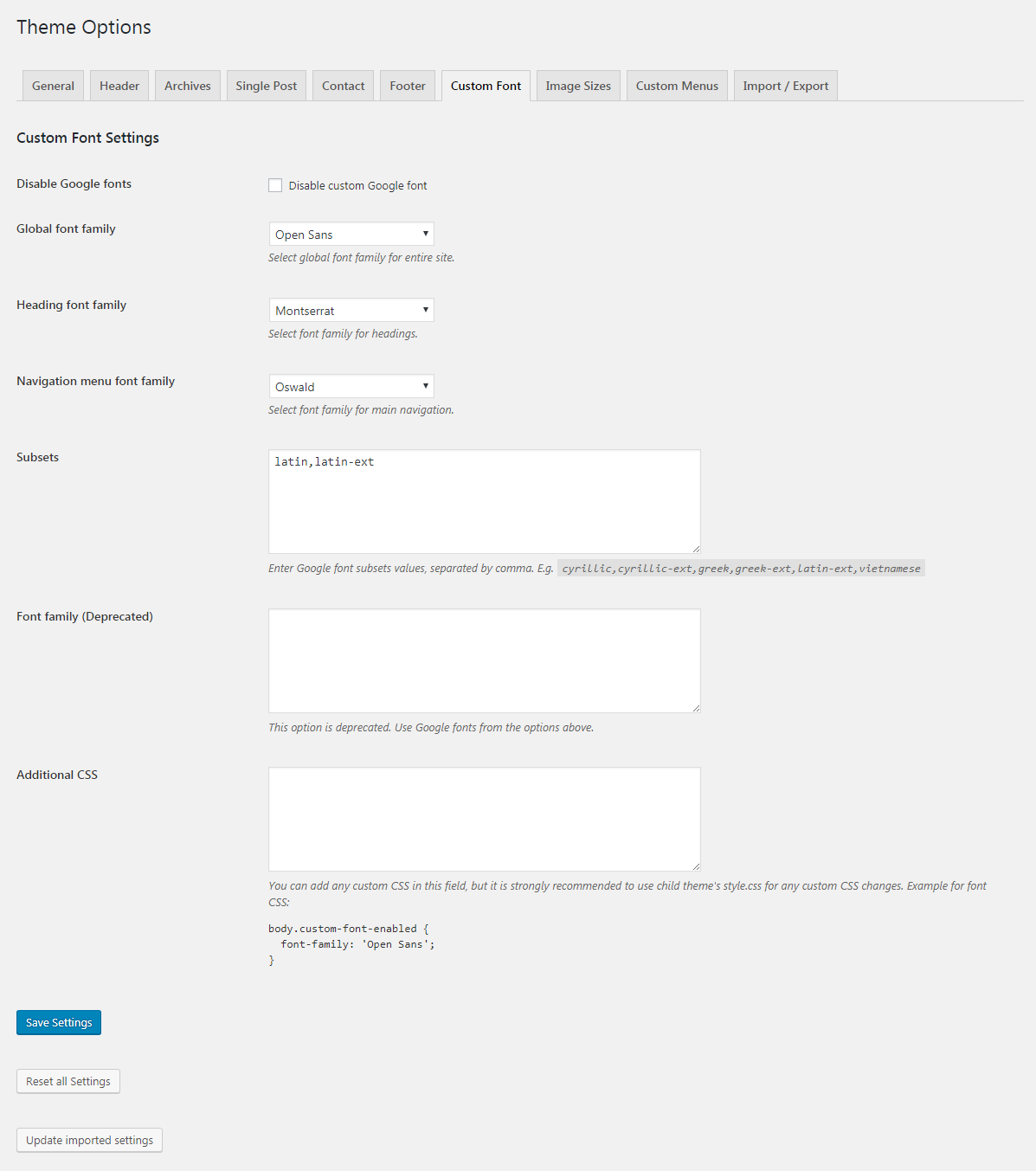 - Unlimted Google Fonts for headings, site body and navigation menu