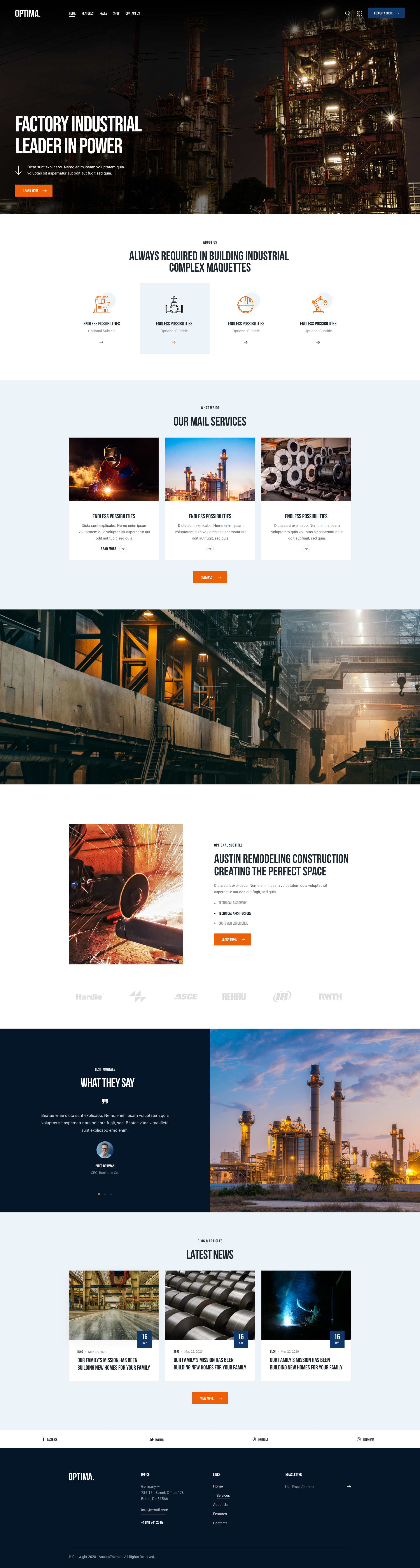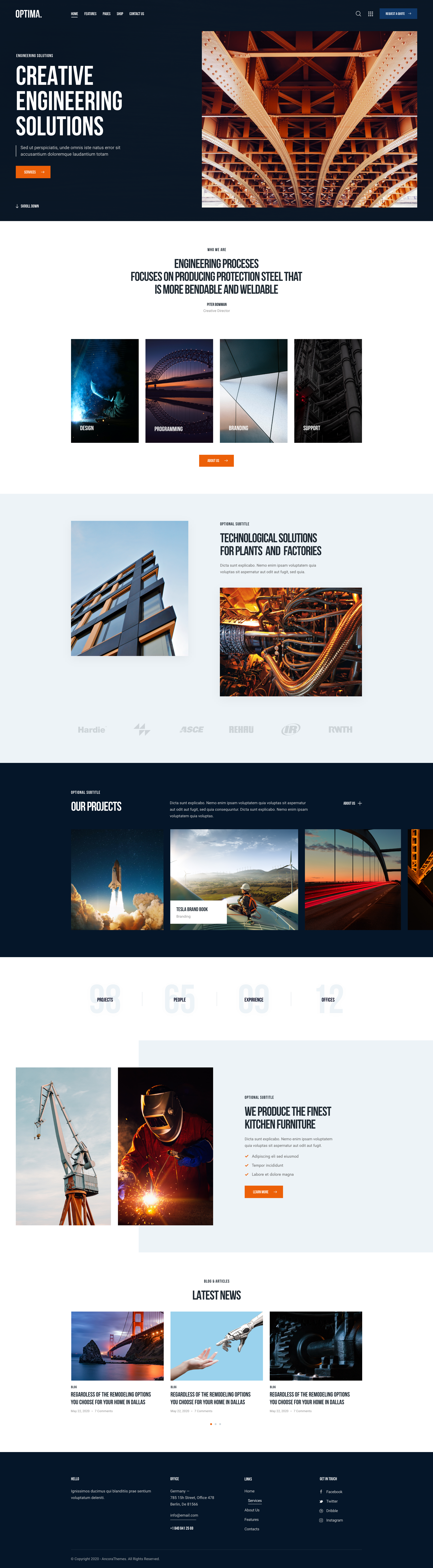 An industrial business has always required an impressive, responsive, modern & bright presentation, especially if one needs to present it online. With Optima you take your industrial company to the next level. If you own any kind of corporate manufacturing firm, developing agency solutions, engineering bureau, or construction organization company, shop, production store this premium WordPress theme is right for you.