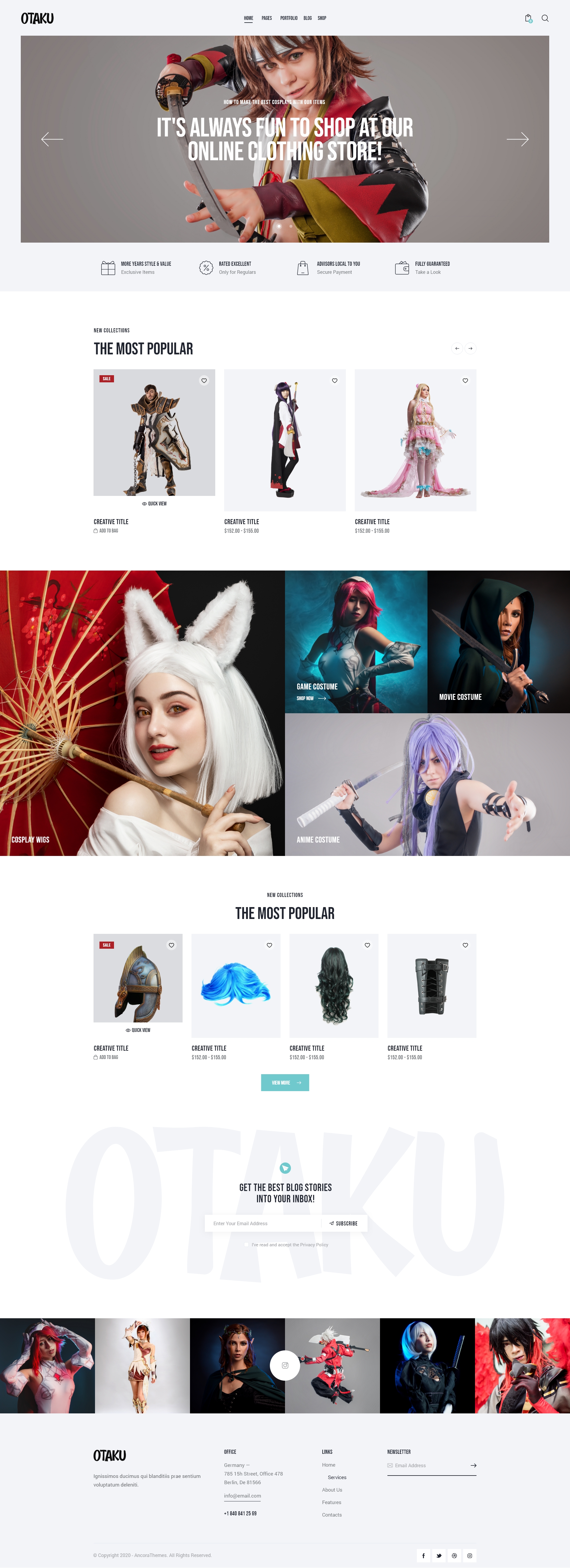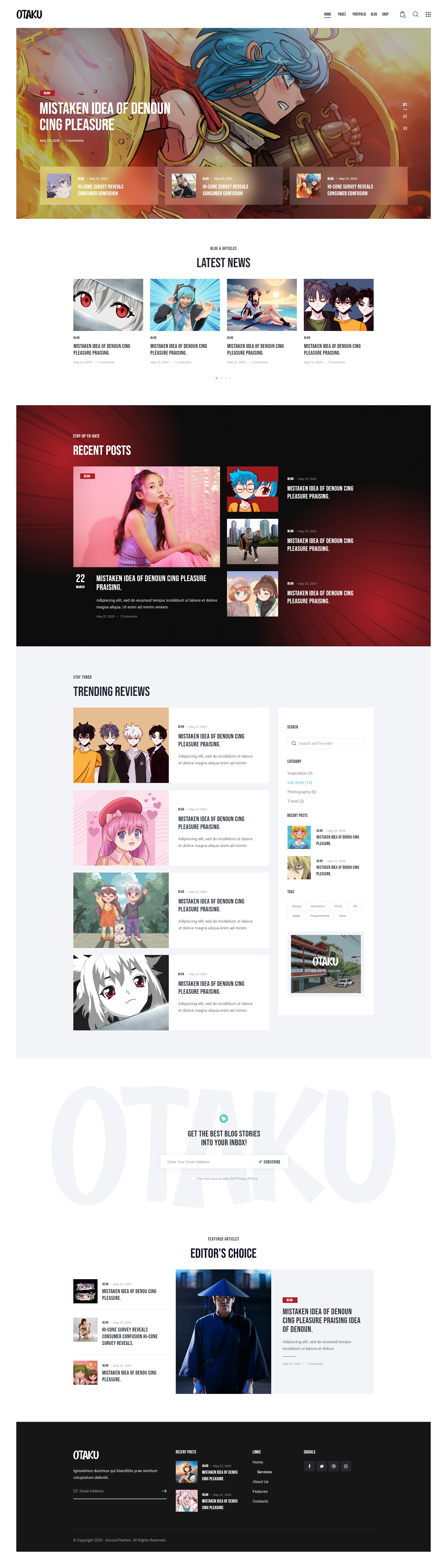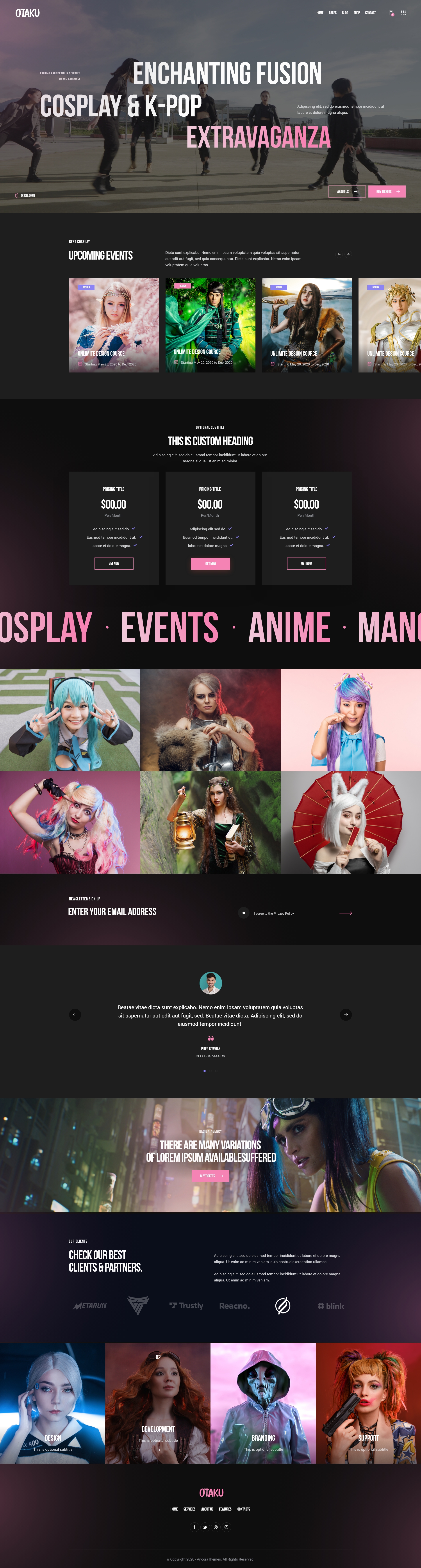 Otaku is a vibrant and cool WordPress theme created for websites related to comics, anime, manga, cosplay, k-pop, cosplay events. This theme can be also used as future video aggregator, artist portfolio, blog, art galley, art gallery, video games shop or an online store of cosplay clothing