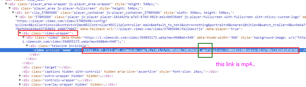 2. A way to get the .mp4 link is possible but it depends on the original source of video is .mp4 format. Upload a .mp4 to vimeo then play it with vimeo player, then right-click on the player, check the Element structure and find div:video-wrapper, copy the src of video. See the picture: