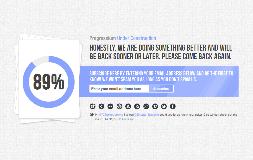 Progressium is a special under construction or development page with fluid fullscreen responsive design, 960 grid system, progress & percentage style, social icons, 40+ background patterns, build with AJAX subscription form which sends you an email with subscribers email address and fade in/out tweets.Changes Log