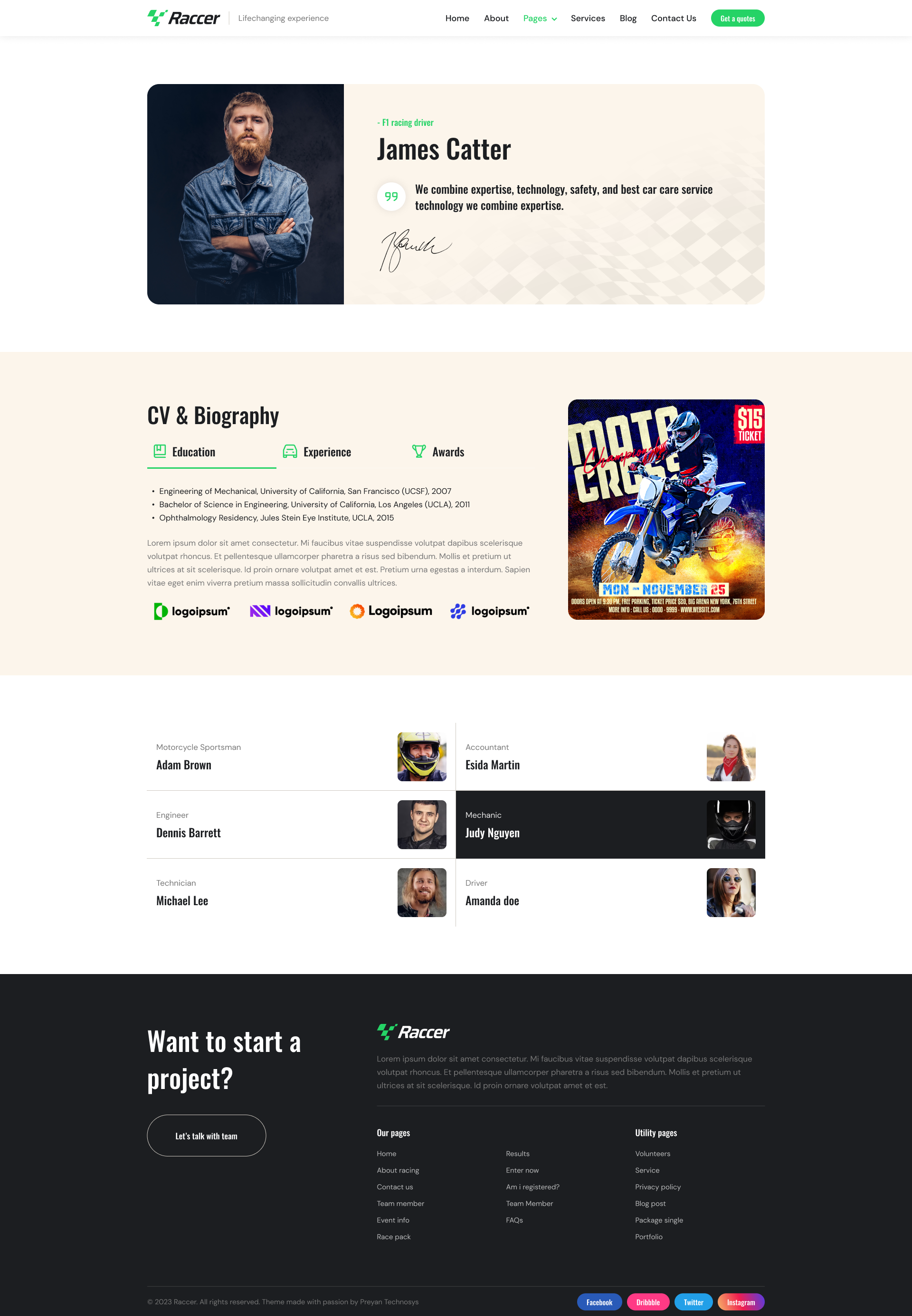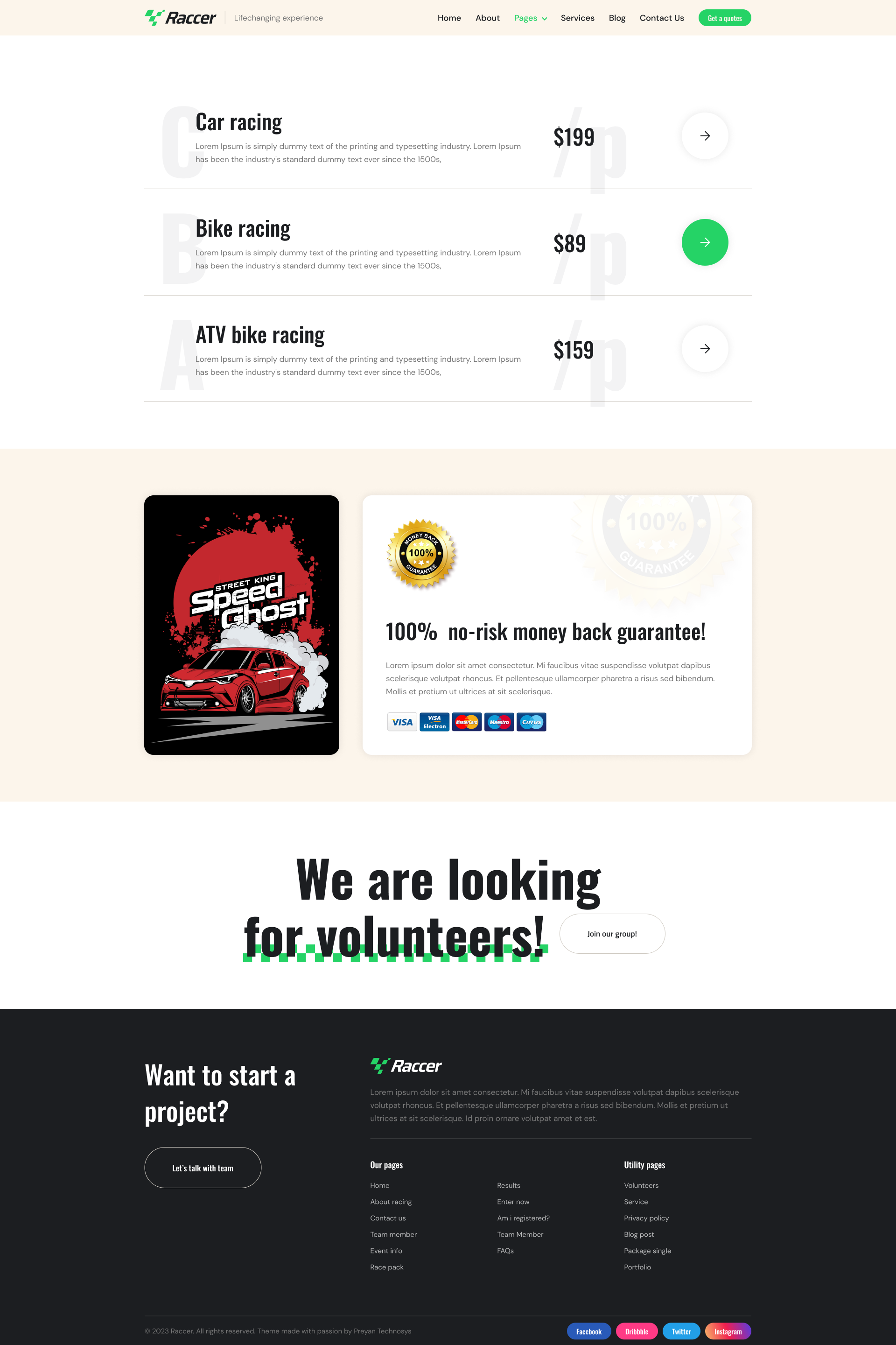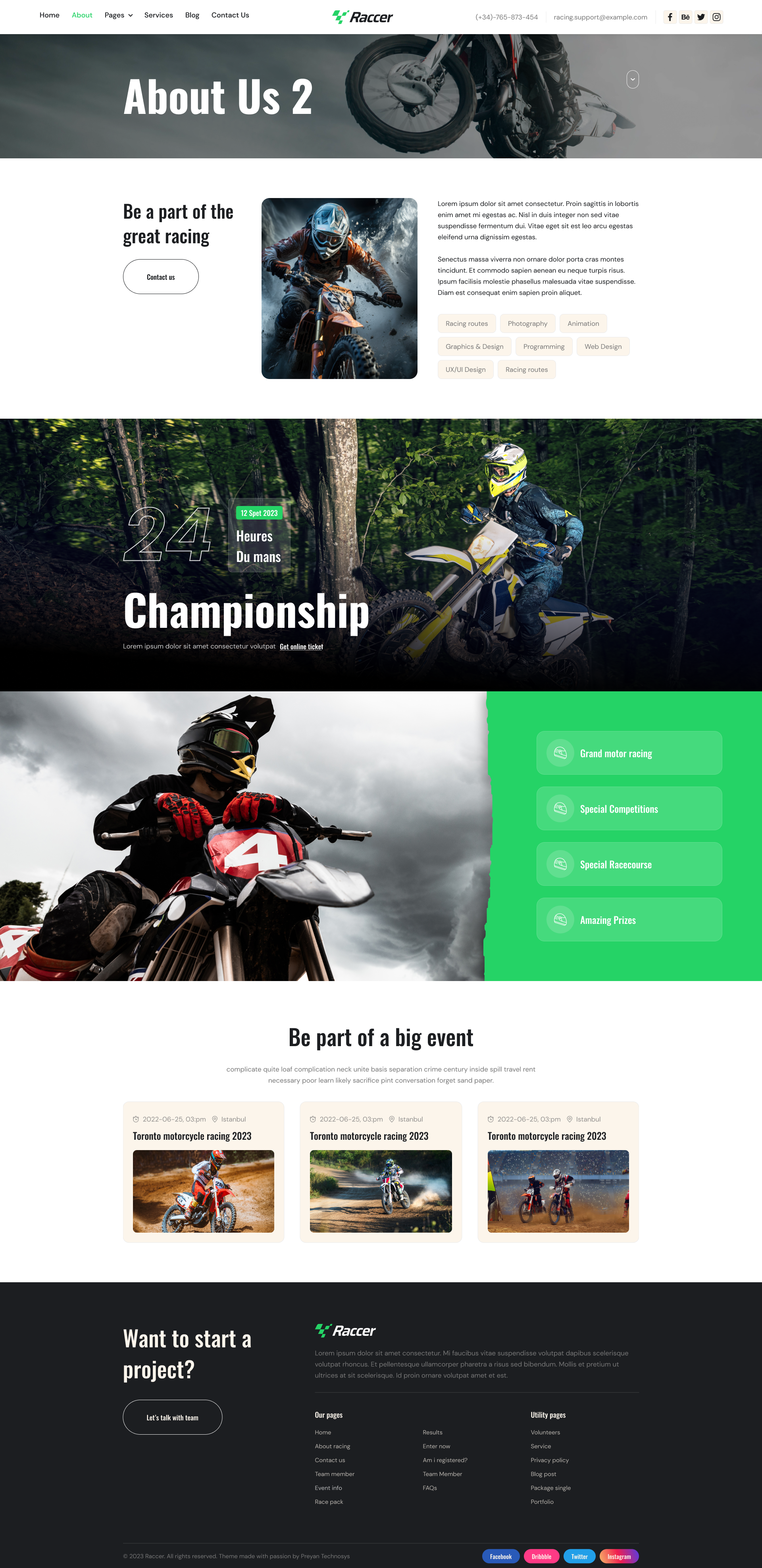 Raccer is a modern & colorful sports events Figma template designed for all kinds of sports events for moto & bike races, competition, race, marathon, eliminator, short track, training, championship, supermoto, downhill events websites.