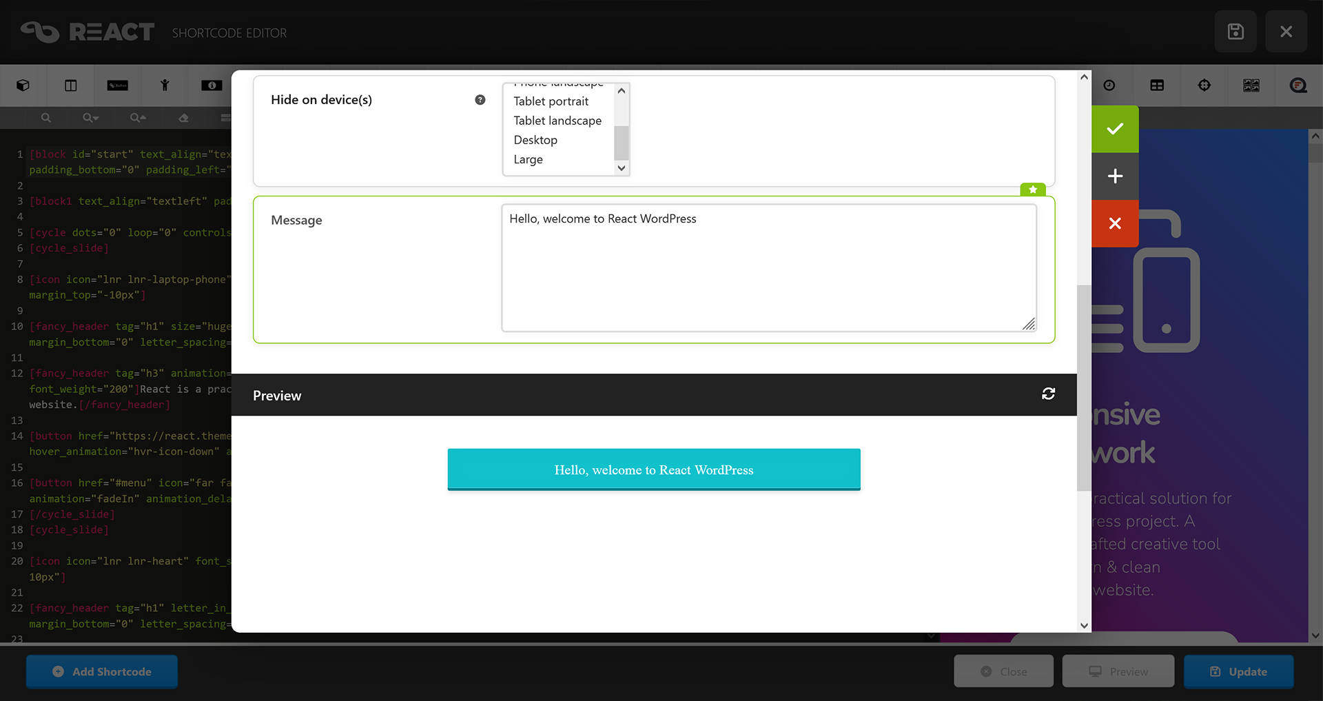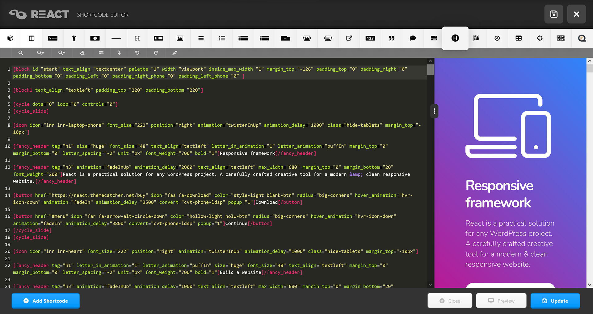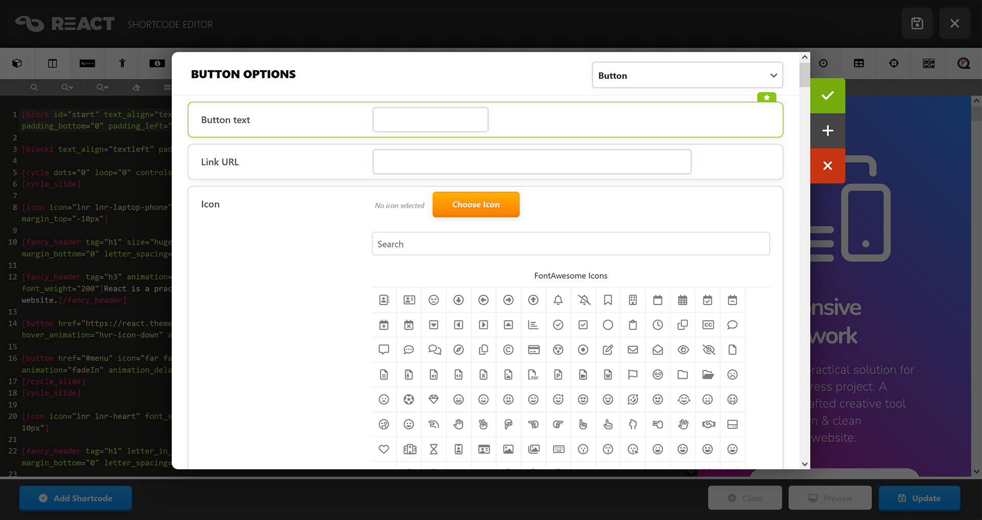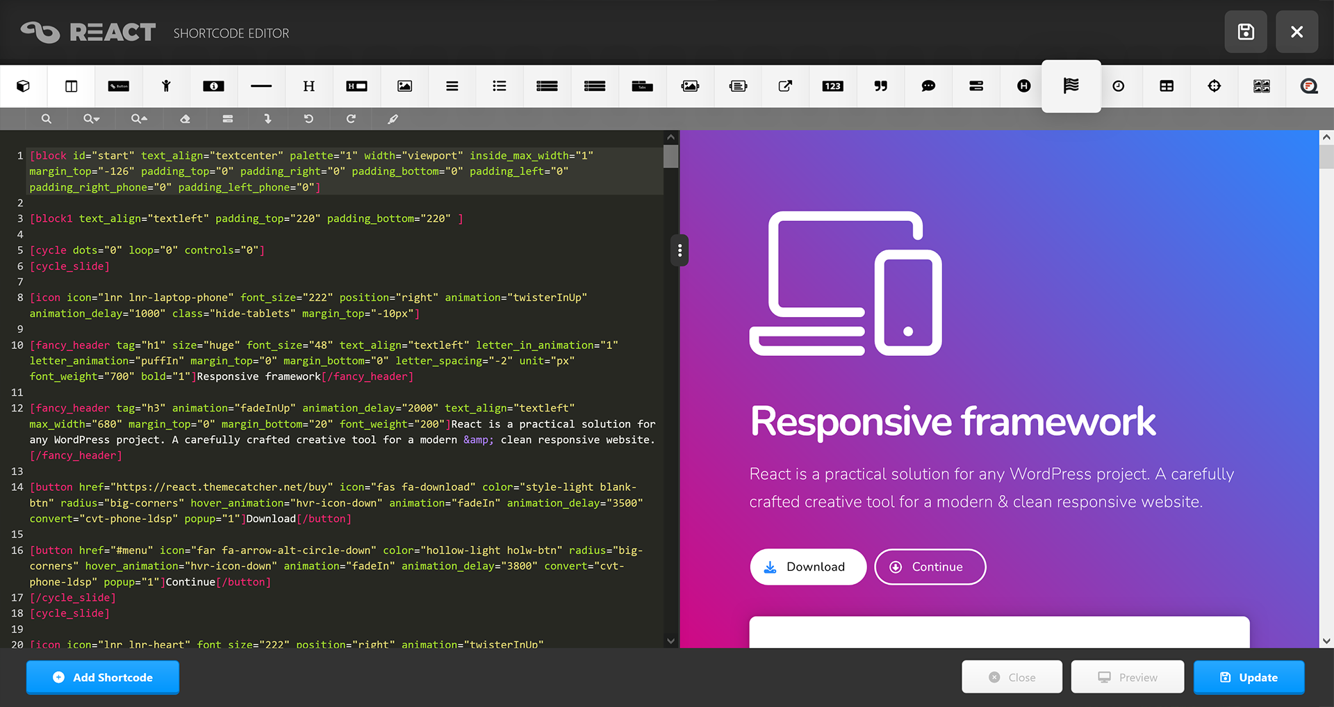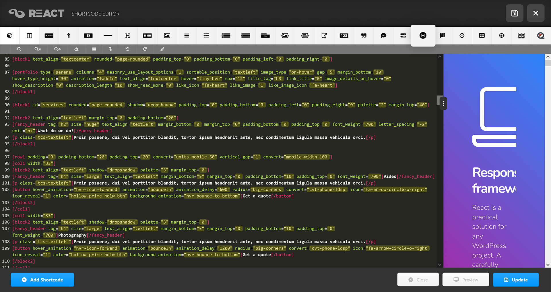 There are 28 React shortcodes all with many variations. Here are some favorites: