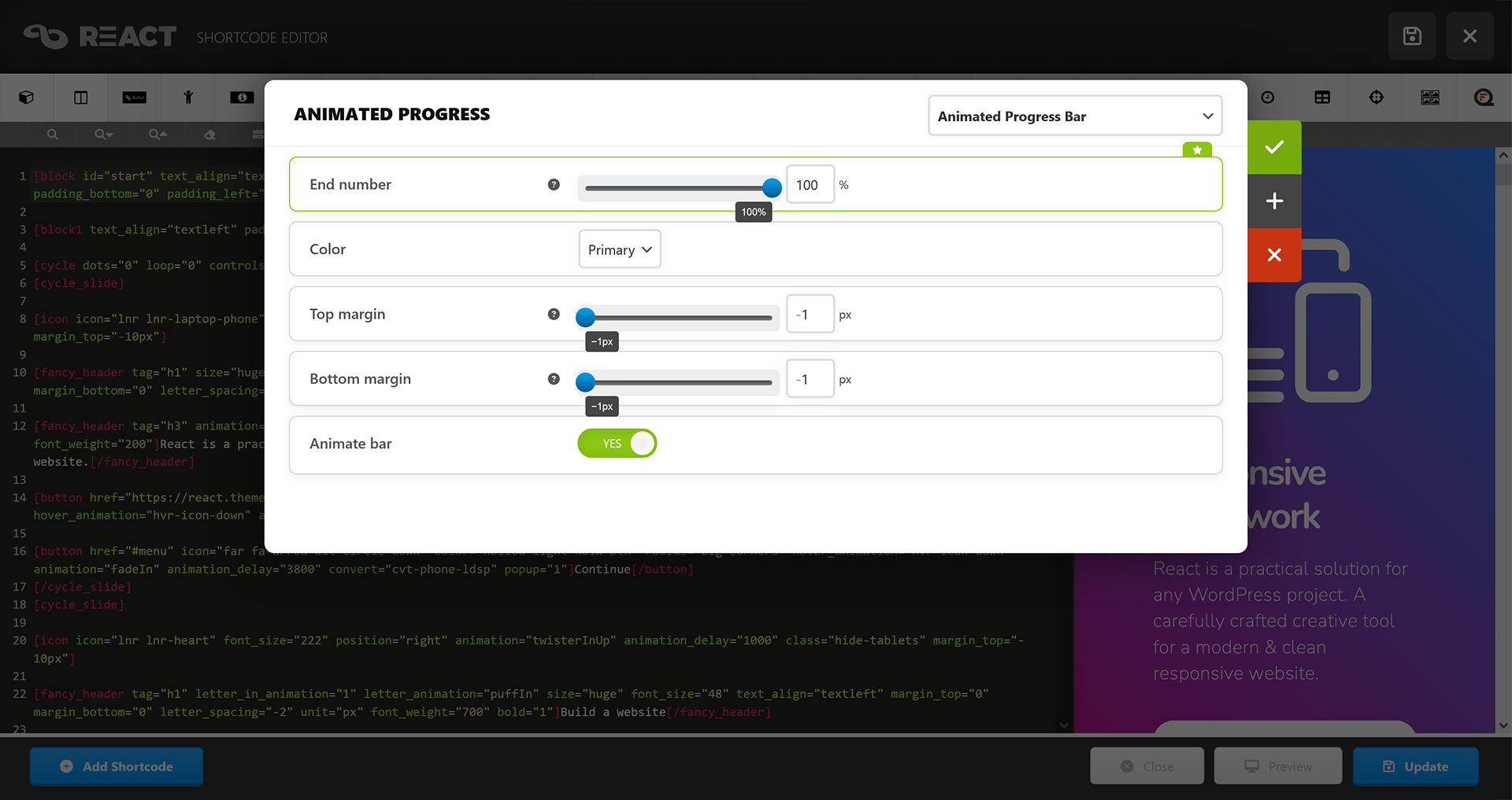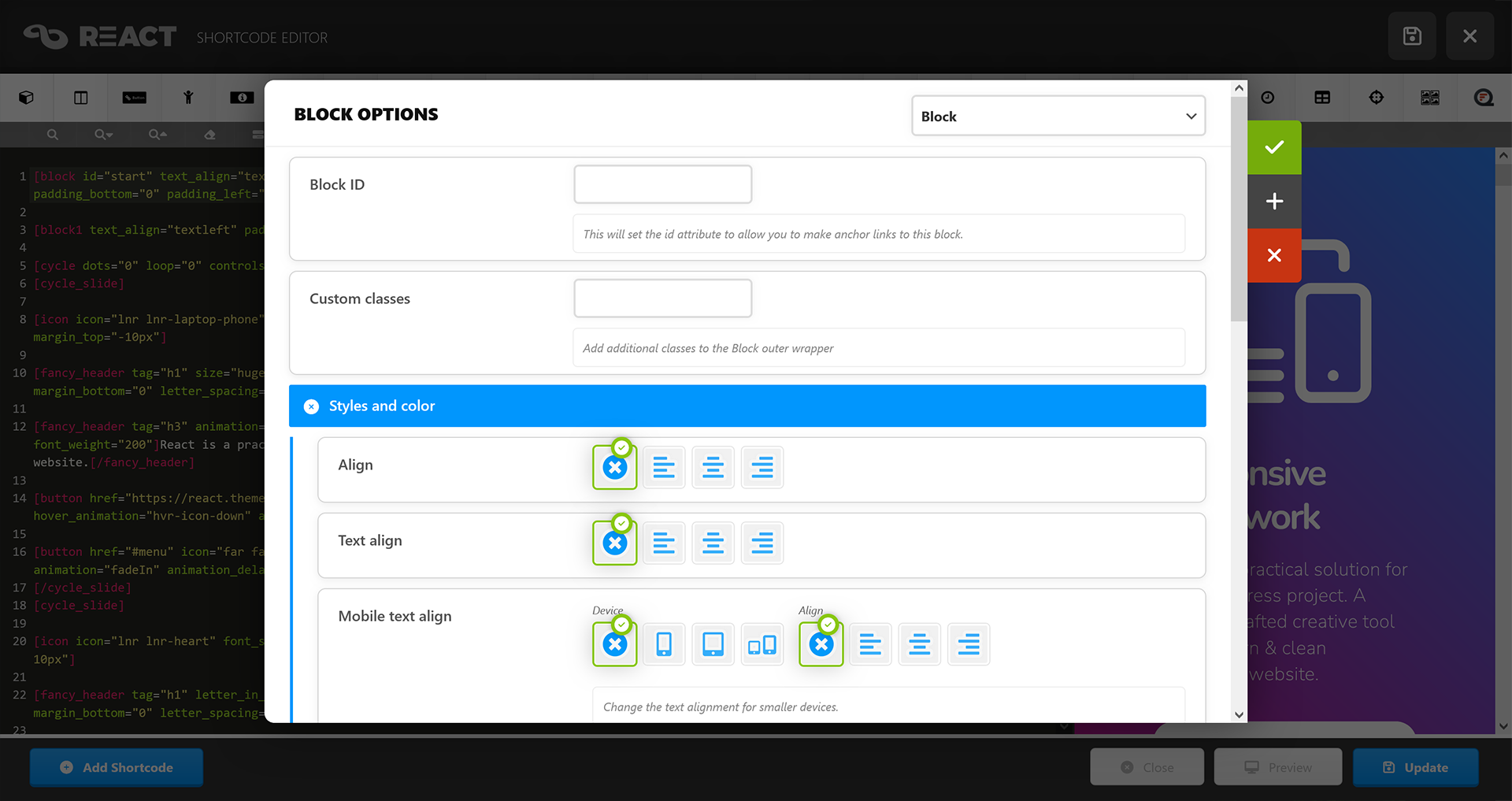 Now, add a splash of color. React has a truly advanced color system which will let you modify colors with ease. Unlimited color palettes can be created and added to sections of your site or to the Block Shortcode to change the colors within that block of content.