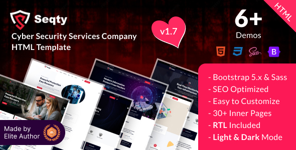 Seqty is a Responsive and Clean HTML template created for Cyber Security Services Company and Individual providers. The template offers 5+ homepage variations design with a blog, blog details other inner pages. It looks stunning on all screens and devices, including Windows, Mac, iOS, Android, etc. This has been built with HTML5, Sass & Bootstrap 5.