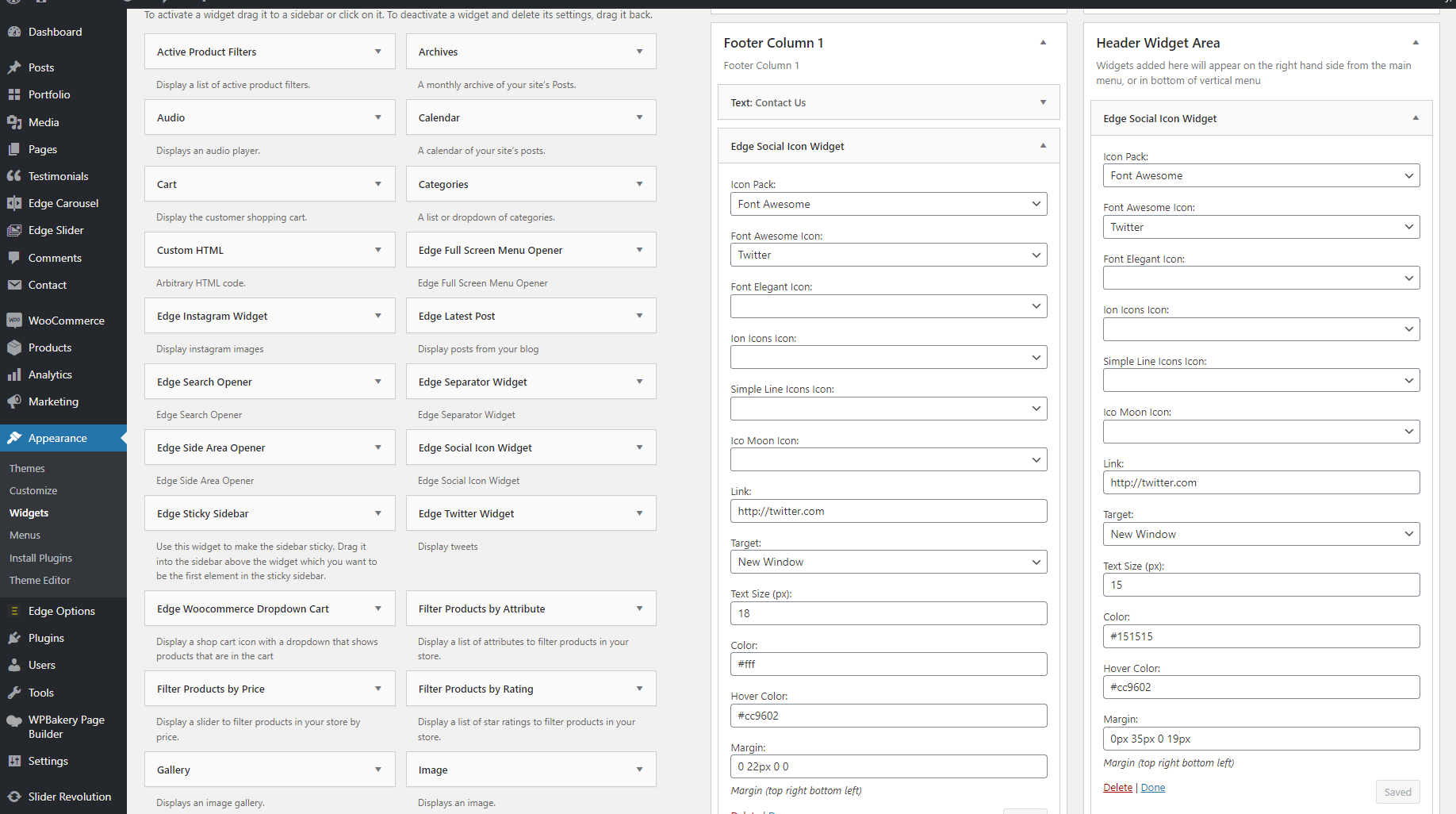 Social Media icons in header and footer can be adjusted through “Edge Social Icon Widget” options in header and footer widget areas in Appearance > Widgets (please see screenshot).