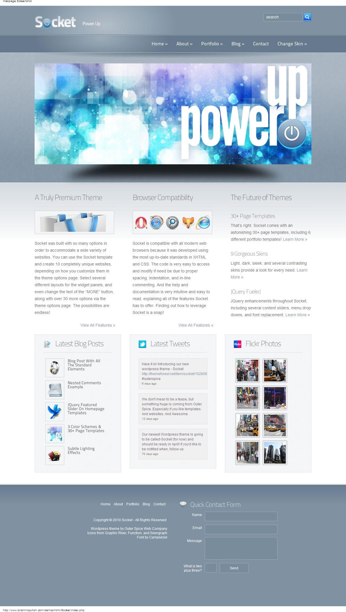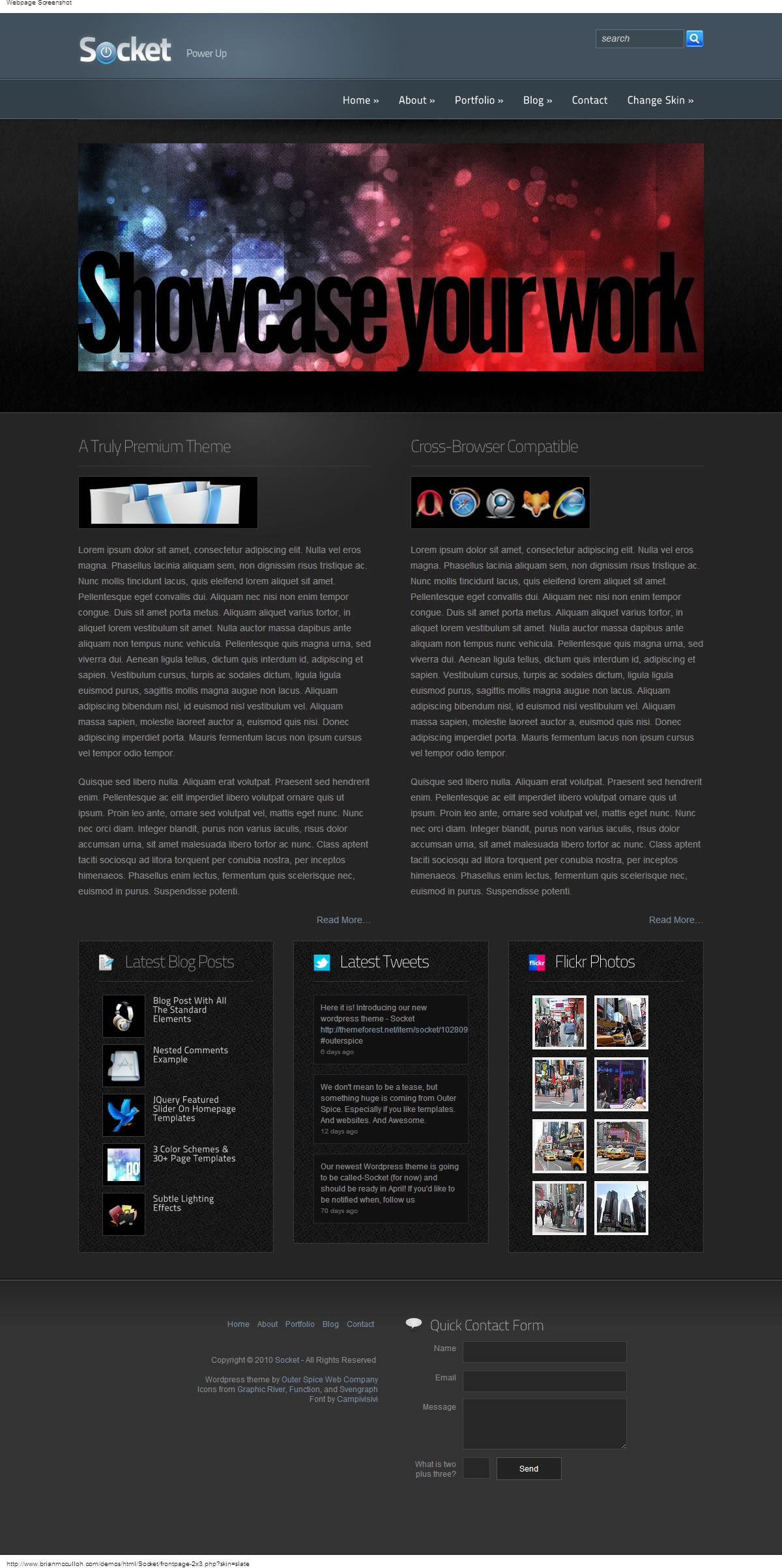 Socket is a very powerful and flexible website template for corporate and/or portfolio use. It was developed using the latest technologies and web coding standards, and employs state-of-the-art features such as Piecemaker 3d rotator, jQuery enhancements, font replacement, AJAX contact forms, social media integration, and more. Here are a few of the most notable features: