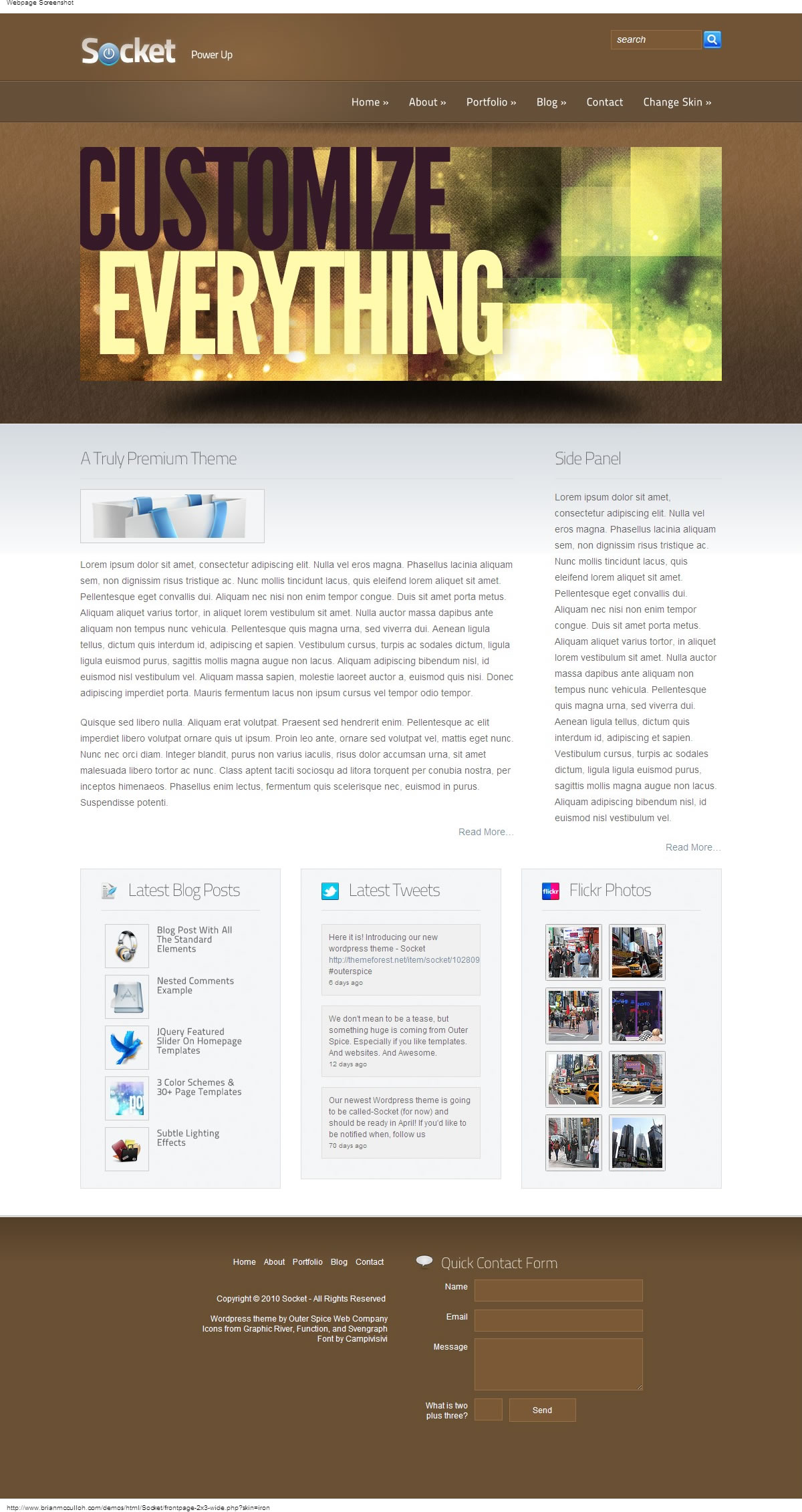 You can create 2 websites that look completely different from each other using Socket, since it has so many page templates and skin combinations. It truly is a premium theme by any and all standards. Here is a full list of features: