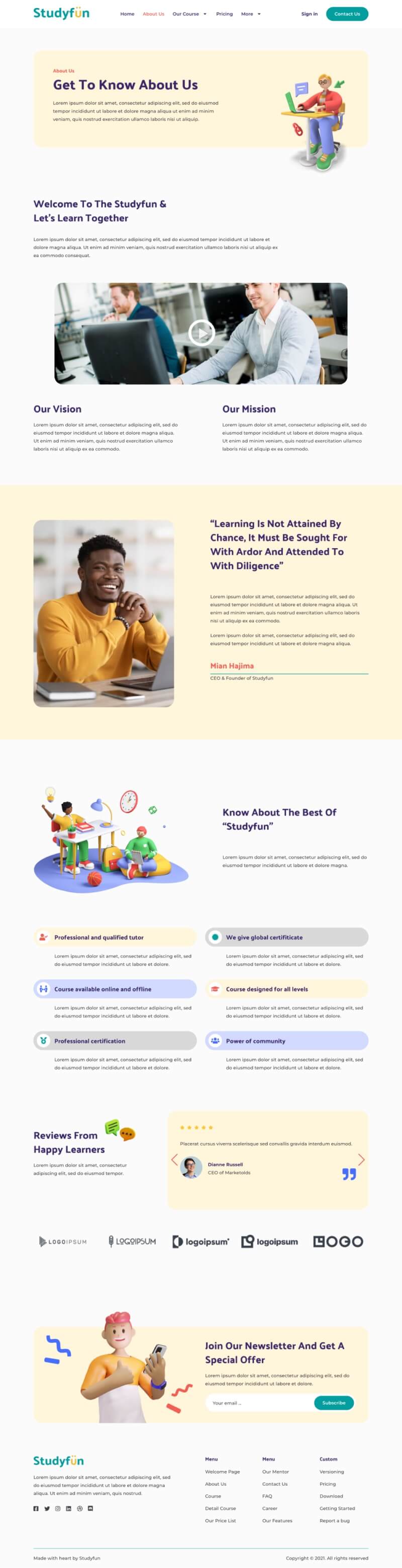 Studyfun is an Elementor Template Kit designed for education and online course delivery. This is not a WordPress theme. Template Kits contain page content for Elementor page builder. This kit has been optimized for use with the free Hello Elementor theme but may be used with most themes that support Elementor. This Template Kits support responsive mobile view. For full information about this template kit, please visit the demo link and enjoy the design.