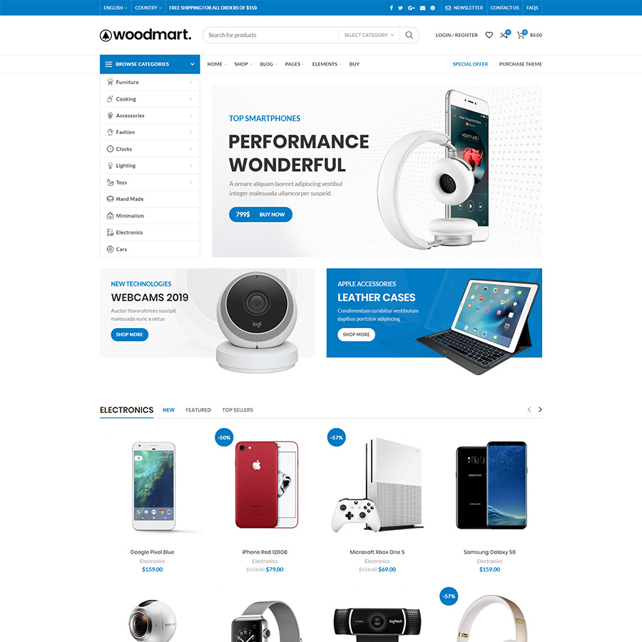 ‘WoodMart’ is a premium WordPress theme designed from the ground up for building supreme WooCommerce online stores of any kind. Focussed on user experience first WoodMart uses a powerful AJAX tech to give users a very fast and seamless online shopping interface without the need to constantly refresh pages.