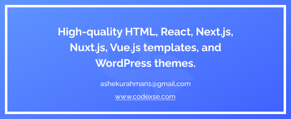 Hey there! I’m Ashekur Rahman, the creator behind Codexse. Dive into my collection of awesome website templates! I’ve got WordPress themes, HTML templates, and cool stuff built with React, Next.js, Nuxt.js, and Vue.js.