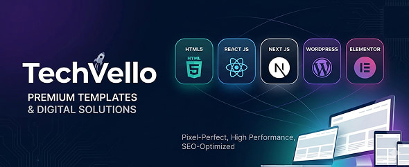Welcome to TechVello — where creativity meets high-performance code. We specialize in crafting modern, lightweight, and fully responsive digital solutions. Our expertise lies in building premium HTML5, React JS, and Next JS templates, along with high-quality WordPress Themes and Elementor Template Kits tailored for modern businesses.